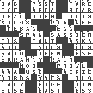ACROSS 1. Small moist lump or mass 4. Inconspicuous attention getter 8. Conductor's collection 12. Frozen water 13. Length times width 14. Hitchcock's "____ Window" 15. Taken by mouth 17. South Vietnam president (1954) 18. Plunders 19. Grain storage towers 21. Parent Teacher Assoc. 23. Born 24. Debunk (Brit. slang) 26. Ovum 28. Connect, as a bridge 30. More disrespectful 34. Raised railways 37. Strained 39. "____ silly question..." 40. Small island 41. _____ Park, CO 43. French article 44. Expressed in words 46. Adolescent 47. Compass dir. 48. Tendancy to err 51. Precipitation 54. Dreamland 55. Move like a hungry wolf 58. Actress Gardner 61. Purpose 63. Nest on high 65. Avian creatures 67. Jacques Cousteau's middle name 71. _ and Stitch 72. Made of lace 73. Travel on an animal 74. Metal container 75. Otherwise 76. Compass direction 77. Double-curved letter DOWN 1. "Vaya con ____" 2. Sour-tasting 3. Calif. Air Force Base 4. Writing tablet 5. Indian title of respect (Mr.) 6. Observe 7. Pack (down) 8. From 9. Period of immesurable duration 10. Assign a rank or rating to 11. Celtic language 16. Tennis shots 18. Straggles 20. Plant excrement 22. Beverage made from leaves 25. Yard entry 27. Girls' org. (abbr.) 29. Difficult 30. Navigate 31. Capri or Wight 32. Supplements with great effort 33. To erase 34. Relaxation 35. One who doesn't tell the truth 36. Disorderly outburst 38. Shoshoni 42. Fastener 45. Daniel's nick name 49. Horse sense 50. Music discs 52. Lyricist Gershwin 53. Christmas carol 56. Compose 57. Ms. Damita and namesakes 58. Competent 59. Small bottle 60. Curves 62. Jane of fiction 64. Immeasurably long periods of time 66. Color 68. By way of 69. Begley and Asner 70. Arrange properly for use
