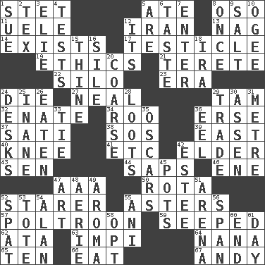 ACROSS 1. Proofreading order 5. Had dinner 8. Bear (Spanish) 11. Ubangi River tributary 12. SW Asia republic 13. Tired old horse 14. Is 17. One of the two male reproductive glands 19. Principles of right and wrong 21. Cylindrical with tapered ends 22. Grain storage tower 23. Period 24. Expire 27. Actress Patricia 29. Scottish cap 32. Maternal 34. Friend of Pooh 36. Celtic language 37. Suttee (variant) 38. Mayday 39. 90 degrees 40. Leg joint 41. And so on (abbr.) 42. A person who is older than you are 43. Elected rep. 44. Plant excrements 46. Compass dir. 47. Auto club (abbr.) 50. Round or rotation of duties 52. A viewer who gazes fixedly 55. Michaelmas daisies 57. Characterized by complete cowardliness 59. Oozed 62. "One Day ___ Time" 63. Body of Kaffir warriors 64. Nanny 65. Nine, plus one 66. Erode 67. Actor Griffith DOWN 1. Institute legal proceedings 2. John Ritter's dad 3. Writer Wiesel 4. Trials 5. "We ___ not amused" (Victoria) 6. Clothes sense 7. Keyboard key 8. Single time 9. Table seasoning 10. Double curve, resembling the letter S 12. ___ a Wonderful Life 15. One or ones belonging to thee 16. Drop; flow; fall 18. Lyricist Gershwin 20. Rough 24. Writing tables 25. Empty; void 26. Eroded 28. Plunders 29. Barter 30. NE Netherlands city 31. Distance measurement (Brit.) 33. Make a knot 35. Motion picture awards 36. Snakelike fish 42. First name in cosmetics 45. Cooking vessels 47. Tate display 48. Nest on high 49. Odor 51. Sports stadium 52. Petty quarrel 53. Carryall 54. ____ Jay Lerner 55. Cuckoo 56. Connect, as a bridge 58. Choose 60. Conclude 61. 24 hours