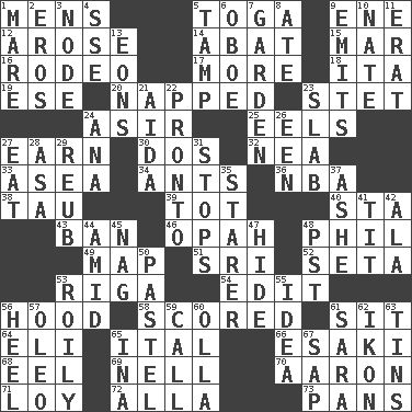 ACROSS 1. Not women's 5. Ancient Roman robe 9. Compass dir. 12. Came up 14. Blind as ____ 15. Spoil 16. Cowboy competition 17. Greater amount 18. Call ___ day 19. Compass dir. 20. Slept 23. Proofreading order 24. SW Saudi Arabia district 25. Snakelike fish 27. Merit 30. Two (Sp.) 32. Teachers' org. 33. At sea 34. Pismires 36. Basketball assoc. 38. The 19th letter of the Greek alphabet 39. Small child 40. R.R. building 43. Bar 46. Brightly colored fish 48. Silvers or Donahue 49. Atlas unit 51. _ Lanka 52. Bristle 53. Capital of Latvia 54. Prepare for publication 56. Parka part 58. Tallied 61. Be seated 64. Connecticut Ivy Leaguer 65. Slanted text style (abbr.) 66. 1973 Nobel Price Winner (Physics) Leo 68. Snakelike fish 69. 1994 drama film starring Jodie Foster 70. Composer Copland 71. Myrna of the movies 72. Silent film actress Nazimova 73. Zero-star reviews DOWN 1. Female horse 2. Greek god of love 3. Thickened enlargement 4. Compass dir. 5. Pack (down) 6. Mitch Miller's instrument 7. Place where plants grow 8. Had dinner 9. Gives off 10. Nathan's nickname 11. Part of Q.E.F. 13. Immeasurably long periods of time 21. Opera by Verdi 22. Right away 23. Broad, flat, thick piece 24. Santa ___, CA 26. Car or cant ending 27. Ingest 28. White ___ sheet 29. Reuben's nickname 31. Ceases 35. A viewer who gazes fixedly 37. American tennis player Robert 41. Teat (slang) 42. Chicken ___ king 44. Among 45. Tired old horse 47. Flintstone garb 48. Pacific Standard Time (abbr.) 50. Soft color 53. Turbulent 55. The main thing one is thinking about 56. The bottom of a shoe or boot 57. Margarine 59. Give a ring to 60. Rounded earthenware pot or jar 61. "Two Mules for Sister ____" 62. Visual representation of an object 63. Airtight sealed metal containers 65. _ tizzy (2 wds.) 67. Plant excrement