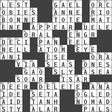 ACROSS 1. For fear that 5. Highlander 9. The grampus (Milton) 12. Off-Broadway awards 14. Queen of England 1702-14 15. _ de Janeiro 16. Child's nurse 17. Lug 18. Floor covering 19. Compass dir. 20. Seem 23. Ubangi River tributary 24. Spoken 25. Engineer (abbr.) 27. Tenth: prefix 30. Baking dish 32. Snakelike fish 33. 1994 drama film starring Jodie Foster 34. Tiny particle 36. Sight organ 38. Black tropical American cuckoo 39. Compass dir. 40. Mouth or opening 43. By way of 46. Oceans 48. Washington bills 49. E Mali city 51. Secret 52. Toward the sea 53. Fly high 54. Austrian river, tributary to the Danube 56. Fermented drink made from hops 58. Keyboard key 61. Santa ___, CA 64. Binary compound 65. Stalk of a moss capsule 66. Stared at amorously 68. Assist 69. Hyperbolic tangent 70. Roamer 71. Filthy place 72. Having or resembling wings 73. Friends DOWN 1. Ear part 2. Inky black, to poets 3. Trig term 4. "___ Little Indians" 5. Yard entry 6. Small Philippine buffalo 7. Main course 8. Area sheltered from the wind 9. Channel Islands abalone 10. Monetary unit of Yemen 11. ____ d'Azur (French Riviera) 13. Dry up 21. Dad 22. Food holders 23. Repulsive 24. Petroleum 26. Born 27. Heredity factor (abbr.) 28. Car or cant ending 29. 154 in Roman numerals 31. Olfactory organs 35. Ear of corn 37. Immeasurably long periods of time 41. Portuguese money of account (variant) 42. White ___ sheet 44. Composer Stravinsky 45. American Automobile Association (abbr.) 47. System (abbr.) 48. Rowing implement 50. Severe or trying experience 53. Morally degraded 55. A really long time 56. Prejudice 57. Prepare for publication 59. Inactive volcano in Sicily 60. Cowardly lion portrayer 61. _ mater 62. Actress Patricia 63. Sums up 65. R.R. building 67. Republican Party