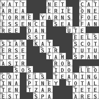 ACROSS 1. Electrical Unit 5. Fish or hair follower 8. Feline 11. Type of rug 12. One of the Great Lakes 14. Single 15. Singer Mel 17. Tall tales 18. Enemy 19. Core 21. Ocean 22. Avid follower 23. Portuguese money of account (variant) 24. One of the 12 tribes of Israel 25. Shoshoni 27. Fast jet (abbr.) 28. Snakelike fish 31. Thailand, formerly 35. Krazy ___ of comics 37. Highlander 38. Celtic language 39. Title for a knight 41. Ballerina skirt 42. Trial 43. Scottish cap 45. Connect, as a bridge 46. SW Saudi Arabia district 47. Director Reiner 49. Distress signal 51. Wedding promise 52. Lion 55. Small bed 57. Raised railways 60. Separating forcefully 62. _ tizzy (2 wds.) 63. Abounding in pines 65. Add up to 66. "___ Little Indians" 67. Czar 68. False hair 69. Eastern Standard Time (abbr.) 70. Health resort 71. Ancient Greek god of war DOWN 1. Wetness 2. Came up 3. Laconic 4. Docile 5. Teachers' org. 6. Blunders 7. Prong on a fork 8. Java holder (2 wds.) 9. Small Philippine buffalo 10. Adolescent 13. He sold his birthright 16. Conclusions 17. Gossips 20. Keg 26. Trials 29. Globular water bottle used in Asia 30. Surprise greatly 31. Bristle 32. Angers 33. Helper 34. Paris' subway 36. Teat (slang) 40. Noteworthy scarcity 44. Method 48. Water vessel 50. Back-to-school mo. 52. 61 cubic inches 53. Related on the mother's side 54. Stares at amorously 55. Quote 56. Singles 58. Belonging to Elizabeth 59. Fastener 61. Roll call or roster of names 64. Period