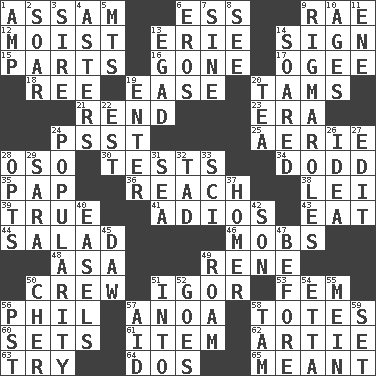 ACROSS 1. Indian state 6. Curvy letter 9. Actress Charlotte 12. Damp 13. 4th largest of the Great Lakes 14. Attach a signature 15. Actors' quests 16. Went 17. Double curve, resembling the letter S 18. To sift 19. Comfort 20. Scottish caps 21. Tear apart 23. Epoch 24. Inconspicuous attention getter 25. Nest on high 28. Bear (Spanish) 30. Trials 34. Texas town _ City 35. Infant food 36. Arrive at 38. Luau accessory 39. Loyal 41. Goodbye (Sp.) 43. Consume 44. First course 46. Crowds into 48. White ___ sheet 49. French philosopher Descartes 50. Ship's personnel 51. Russian composer Stravinsky 53. Opposite of masc. 56. Silvers or Donahue 57. Small Philippine buffalo 58. Hauls 60. Puts into a specified state 61. A distinct part 62. Nick name for Arthur 63. Attempt to accomplish something 64. Two (Sp.) 65. Intended DOWN 1. Electrical Unit 2. Fly high 3. The founder of a family 4. Michaelmas daisies 5. Mountains (abbr.) 6. Greek god of love 7. Trig term 8. Perceive with the eye 9. Complicated, petty procedures 10. Grows older 11. Compass dir. 13. Mild oath 14. Flew 19. Keyboard key 20. Beverage made from leaves 22. Eastern Standard Time (abbr.) 24. Teen's desire 26. It may be bright or harebrained 27. Prepare for publication 28. Elects 29. "Two Mules for Sister ____" 31. Ocean 32. Small boy 33. _-fi 37. Home run 40. Artist's stands 42. Manchild 45. Simpleton 47. Prior to 49. Wander aimlessly 50. "Mermaids" star 51. To the inside or interior of 52. Moves 54. Singer James 55. Count _ (2 wds.) 56. Pacific Standard Time (abbr.) 57. Help 58. Scottish cap 59. Arrange properly for use