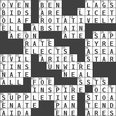 ACROSS 1. Baking chamber 5. Benjamin's nick name 8. Falls behind 12. Auction offers 13. "We ___ not amused" (Victoria) 14. It is permitted: Lat. 15. Norwegian king 16. Rotating or pertaining to rotation 19. Pipe bend 20. Refrain by choice 21. A really long time 23. Had dinner 24. Plant excrement 27. Assign a rank or rating to 30. Jane of fiction 31. Opts 34. At sea 35. Tending to cause great harm 38. Satellite of Uranus 40. Play the lead 41. Airtight sealed metal containers 42. Undo the wiring of 44. Nathan's nickname 45. Anneal 46. Everything 47. Enemy 50. Fast planes 53. Stimulate to action 57. Sep. follower 59. Supplementary 63. Portico 64. Related on the mother's side 65. Baking dish 66. Watch over 67. Opera by Verdi 68. Compass dir. 69. Ancient Greek god of war DOWN 1. Mitch Miller's instrument 2. Country estate 3. Peak District village in England 4. Overdraft (abbr.) 5. Sharp remark 6. Greek god of love 7. Remaining after all deductions 8. 54 in ancient Rome 9. Adept person 10. Set 11. Filthy place 14. Actor's bit 17. American Automobile Association (abbr.) 18. Teat (slang) 20. Of or related to the anus 22. Threatening words 24. System (abbr.) 25. Length times width 26. Lightbulb-shaped fruit 28. Beverage made from leaves 29. Shade of tan 30. Artist's stands 32. Metal container 33. Stitched 35. Inactive volcano in Sicily 36. Small bottle 37. International (abbr.) 39. Untruth 43. To erase 47. Do some clerical work 48. Single 49. Eastern Standard Time (abbr.) 51. Carrier 52. Biscuitlike quick bread 54. Corncob 55. "Terrible" tsar 56. French philosopher Descartes 58. Bits 59. Ocean 60. Corn or form start 61. Writing tablet 62. Parent Teacher Assoc. 63. R.R. building