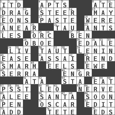 ACROSS 1. It would 4. Flats, for short 8. Had dinner 11. To be drawn or hauled along 13. Bull 15. Fifth month 16. Immeasurably long periods of time 17. Thick mixture 18. Past tense of be (plural) 19. Approach 21. The 19th letter of the Greek alphabet 22. Pismires 23. French article 24. The grampus (Milton) 27. Benjamin's nick name 29. Mitch Miller's instrument 30. Peak District village in England 34. 54 in ancient Rome 36. Strained 39. Soviet premier 1918-24 40. Relaxation 41. Slender Brazilian palm 43. Tear apart 44. Excessive but superficial compliments 46. Snakelike fish 47. She-sheep 48. Father Junipero _ 49. Engineer (abbr.) 51. _ moment's notice (2 wds.) 53. R.R. building 54. Erode 57. Inconspicuous attention getter 60. Lion 63. Effrontery 65. Toward shelter 66. Before Barbara or Clara 69. Within a short period 70. Fenced enclosure 71. Witty Wilde 72. Prepare for publication 73. Find the sum of 74. Wig 75. Begley and Asner DOWN 1. Standard of perfection 2. Heavy duty weighing machine 3. Natives or inhabitants of Denmark 4. Cleo's killer 5. Parent Teacher Association (abbr.) 6. Trial 7. Stalk of a moss capsule 8. So be it 9. Small pie 10. Snake ____ (dice throw) 12. Girls' org. (abbr.) 14. Reuben's nickname 18. Roamer 20. Director Reiner 25. Round or rotation of duties 26. Desist 28. Snakelike fish 29. Make much ado about nothing 31. Afresh 32. Actor's bit 33. Conclusion 34. Unable to walk 35. Austrian river, tributary to the Danube 37. Purpose 38. Falsehoods 40. Curvy letter 42. Is not 45. Floor covering 50. Separate the seeds from cotton 52. In addition 54. Eat (away) 55. Shun 56. Portable shelters 57. Dad 58. Downhill vehicle 59. Post 61. 90 degrees 62. Single time 64. Compass dir. 67. Make lace 68. "We ___ not amused" (Victoria)