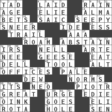 ACROSS 1. Small boy 4. Put down 8. Water falling in drops from the sky 12. Personal question 13. Writer Wiesel 14. _ mater 15. Stakes 17. Ketch in the Levant 18. Not well drained, as in land 19. Scornful expression 21. Binary compound 23. Curvy letter 24. Go after with the intent to catch 26. American Automobile Association (abbr.) 28. Wander aimlessly 30. Refrain by choice 34. Big collection agency 37. 1994 drama film starring Jodie Foster 39. Johnson of "Laugh-In" 40. Born 41. Honkers 43. Erode 44. Small valley 46. Utensil 47. Keyboard modifier key 48. Positions of authority 51. Light colored 54. Morning condensation 55. Typical standards 58. It is 61. Modern: prefix 63. Peter (Polish) 65. Relatively large 67. Goad 71. Singer Brickell 72. Pig sound 73. Travels 74. Connecticut Ivy Leaguer 75. Round or rotation of duties 76. Hollow 77. Elected rep. DOWN 1. Bar bills 2. Rep 3. Prevent from occurring 4. French article 5. Wing 6. One more than two 7. Tenth: prefix 8. Actress Charlotte 9. Toward shelter 10. Naughty children 11. Negative votes 16. Singe 18. Oceans 20. River (Sp.) 22. Pat or tap gently 25. Austrian-born American filmmaker Fritz 27. _ moment's notice (2 wds.) 29. Confronts 30. Columnist Joseph or Stewart 31. Length times width 32. Slanted text style (abbr.) 33. Remaining after all deductions 34. Southeast Asian peninsula 35. Coral ridge 36. Automatic 38. Lion 42. Enthusiasm 45. Flaplike covering 49. Penny 50. She-sheep 52. Trim (branches) 53. 4th largest of the Great Lakes 56. Methods 57. Vertical member of a panel or frame 58. Composer Stravinsky 59. Musical group of three 60. Emitted 62. Ending for "Through" and "Enough" 64. It's straight from the horse's mouth 66. Alias (abbr.) 68. Friend of Pooh 69. Set 70. Compass dir.