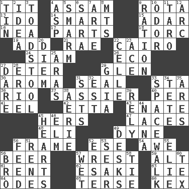 ACROSS 1. Teat (slang) 4. Indian state 9. Round or rotation of duties 13. Wedding promise 14. Don Adams' spy role 15. The sixth month of the Jewish calendar 16. Teachers' org. 17. Components 18. Torque (variant) 19. Find the sum of 21. Actress Charlotte 22. Capital of Egypt 24. Thailand, formerly 26. Environmental prefix 27. Prevent from occurring 29. Small, secluded valley 30. Odor 31. Lick closed 33. R.R. building 36. River (Sp.) 37. More impudent 40. For each 41. Snakelike fish 42. Singer James 43. Related on the mother's side 45. Possessive pronoun 47. Shoestrings 48. Connecticut Ivy Leaguer 49. Centimeter-gram-second unit of force 50. Movie unit 52. Compass dir. 54. Deep reverence 56. Fermented drink made from hops 57. Take or capture by force 59. The first octave above the treble staff 61. Monthly bill 62. 1973 Nobel Price Winner (Physics) Leo 63. Whopper 64. Lyric poems 65. Laconic 66. Dry husk or covering DOWN 1. Shallow baking pan 2. It may be bright or harebrained 3. Inedible or poisonous agaric 4. Cleo's killer 5. Excessive but superficial compliments 6. "Two Mules for Sister ____" 7. Johnson of "Laugh-In" 8. Mountains (abbr.) 9. Food allowance for one day 10. Scent 11. Edible starchy tuberous root 12. Curve 20. South Vietnam president (1954) 22. Cell (Danish) 23. Adept person 25. Ancient river in northeast Turkey 27. Have the gumption 28. One of the Great Lakes 29. Greek goddess of the earth (variant) 31. Fast planes 32. Eastern Standard Time (abbr.) 33. High altitude stroll 34. False hair 35. Ancient Greek god of war 38. Nest on high 39. Depend 44. Grandmother 45. Centers 46. Shade tree 49. Writing tables 50. Nourish 51. French philosopher Descartes 52. Celtic language 53. Shrivel 55. Writer Wiesel 56. Sis' sibling 57. Soggy 58. Neckwear 60. John Ritter's dad