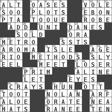 ACROSS 1. The first octave above the treble staff 4. Fertile tracts in a desert 9. Grand slam 13. "Barney Miller" actor Jack 14. Graphs 15. Inky black, to poets 16. Parent Teacher Assoc. 17. Woman's close-fitting hat 18. Loose flowing garment 19. Find the sum of 21. University (slang) 22. Natives or inhabitants of Denmark 24. Disposed of to a purchaser 26. Mouth or opening 27. Paris' subway 29. Fast planes 30. Odor 31. Small island 33. Grow older 36. _ de Janeiro 37. Modes 40. Wily 41. Snakelike fish 42. Confront 43. Failure 45. Demure 47. Place in a line 48. Allow 49. Snake ____ (dice throw) 50. Trading vessels 52. Attila the _ 54. Baseball player Mel 56. A blast of a horn 57. Pitcher Ryan 59. Sandy's bark 61. Medicinal plant 62. Declaim 63. Teachers' org. 64. Floor coverings 65. The wife of a rajah (variant) 66. "___ Little Indians" DOWN 1. Cleo's killer 2. Globular water bottle used in Asia 3. Inedible or poisonous agaric 4. Choose 5. Verbally 6. Within a short period 7. Needle case 8. Compass dir. 9. Actresses Bloom and Felton 10. Mitch Miller's instrument 11. Tennis shots 12. Compass dir. 20. Dormintory (informal) 22. Administered medicine 23. Tate display 25. Rich soil 27. Female horse 28. One of the Great Lakes 29. Slit 31. Detail 32. A female animal or person 33. Aide 34. Small, secluded valley 35. Jane of fiction 38. Sends forth 39. Kill 44. Butter sub 45. Food holders 46. Marina Del _, California 49. Related on the mother's side 50. Root beer relative 51. Carrot, for example 52. Israeli folk dance 53. Uhlan (variant) 55. Family _ (genealogy) 56. Scottish cap 57. Not either 58. Born 60. Air blower