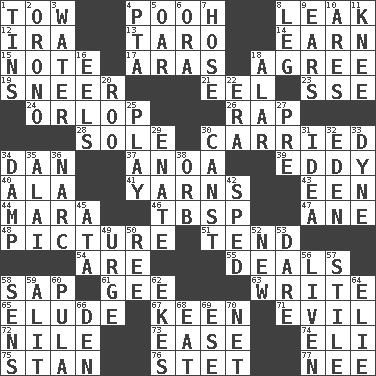 ACROSS 1. Pull behind 4. "Silly old bear" 8. Path through which fluid escapes 12. Retirement account (abbr.) 13. Pacific island yam 14. Merit 15. Make mention of 17. Ancient river in northeast Turkey 18. Match 19. Contemptuous expression 21. Snakelike fish 23. Compass dir. 24. Fourth or lowest deck 26. Strike 28. Not divided or shared with others 30. Borne 34. Daniel's nick name 37. Small Philippine buffalo 39. Whirlpool 40. According to 41. Entertaining tales 43. Car or cant ending 44. Hindu Mythology: god of death 46. Cook's measure (abbr.) 47. One (Scot) 48. Photo 51. Be inclined (to) 54. "We ___ not amused" (Victoria) 55. Allots cards 58. Plant excrement 61. Unit of force equal to gravity 63. Compose 65. Evade 67. Peachy ____! 71. Tending to cause great harm 72. The longest river in the world 73. Relaxation 74. Connecticut Ivy Leaguer 75. Comedian Laurel of Laurel & Hardy 76. Proofreading order 77. Born DOWN 1. Canisters 2. U. of Maine site 3. Wetness 4. Parent Teacher Assoc. 5. Rowing implement 6. Mouth or opening 7. Stockings 8. Part of a journey 9. Hearing organs 10. Ancient Greek god of war 11. Leg joint 16. Snakelike fish 18. Having or resembling wings 20. Friend of Pooh 22. Period 25. Shaw product 27. Before (prefix) 29. Maternal 30. 2nd pers. sing. pres. of can (arch.) 31. It may be bright or harebrained 32. Genesis locale 33. Centimeter-gram-second unit of force 34. Moist 35. Jai _ 36. Drug cop 38. Globe 42. Hurried 45. _ moment's notice (2 wds.) 49. Goad 50. Portuguese money of account (variant) 52. ___ Haven, CT 53. Have the gumption 56. Make or become more lively 57. Vertical member of a panel or frame 58. Elected reps. 59. Came down and settled, as after flight 60. Monetary unit of Botswana 62. Makes supply last 64. Writer Wiesel 66. Lair 68. Ingest 69. Compass dir. 70. Fish or hair follower