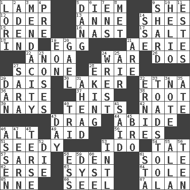 ACROSS 1. Desk light 5. South Vietnam president (1954) 9. A female animal or person 12. Baltic tributary 13. Queen of England 1702-14 14. "______ My Girl" (Turtles hit) 15. French philosopher Descartes 16. Political cartoonist Thomas 17. Table seasoning 18. Indiana (abbr.) 19. Ovum 21. Nest on high 22. Small Philippine buffalo 24. Armed conflict 26. Two (Sp.) 27. Biscuitlike quick bread 28. One of the Great Lakes 29. Raised platform 30. Member of a famous L.A. basketball team 32. Inactive volcano in Sicily 36. Johnson of "Laugh-In" 37. Part of HMS, perhaps 38. Carrot, for example 39. Negative votes 40. Portable shelters 42. Nathan's nickname 43. To be drawn or hauled along 44. Stay 46. The first octave above the treble staff 49. Assist 50. Angers 51. Sleazy 53. Wedding promise 54. Make lace 57. Indian skirt 58. Paradise 61. Flatfish 62. Celtic language 63. System (abbr.) 64. Lacquered or enameled metalware 65. Compass dir. 66. Stitch closed the eyes of (a falcon) 67. ____ Jay Lerner DOWN 1. Australian parrot (variant) 2. An important port of Yemen 3. Ananias' fault 4. Before (prefix) 5. Mild oath, euphamism for damn 6. _ tizzy (2 wds.) 7. Followers of ems 8. Was introduced to 9. Pottery fragment 10. Sun: prefix 11. _____ Park, CO 14. Compass dir. 19. Period of immesurable duration 20. Highlander 21. "We ___ not amused" (Victoria) 23. Olfactory organs 24. Take or capture by force 25. Wind 27. "Two Mules for Sister ____" 28. Supplementing with great effort 29. One of the 12 tribes of Israel 31. Having the leading position 32. Bert's buddy 33. Inedible or poisonous agaric 34. Observe 35. Had dinner 40. Three (prefix) 41. Alleged 43. 24 hours 45. Sis' sibling 46. NE Netherlands city 47. Acquire or gain knowledge or skills 48. Laconic 52. Expire 53. International (abbr.) 55. Silent film actress Nazimova 56. Adolescent 58. Curvy letter 59. Color 60. Compass dir. 61. R.R. building