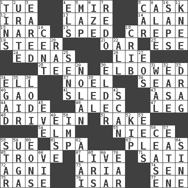 ACROSS 1. Third day of the wk. 4. Independent ruler or chieftain 8. Keg 12. Retirement account (abbr.) 13. Goldbrick 14. Actor Alda or Thicke 15. Drug cop 17. Hurried 18. Streamer paper 19. Navigate 21. Boat paddle 23. Compass dir. 24. Ferber et al. 26. Whopper 28. Adolescent 30. Shoved, as through a crowd 34. Pipe bend 37. Christmas carol 39. Singe 40. E Mali city 41. Bobsleighs 43. White ___ sheet 44. Helper 46. Actor Baldwin 47. Part of a journey 48. Popular '50s hangout 51. Libertine 54. Shade tree 55. Sibling's daughter 58. Institute legal proceedings 61. Health resort 63. Entreaties 65. Collection of objects 67. Moving, as bait 71. Suttee (variant) 72. Hindu god of fire 73. Roberta Peters solo 74. Elected rep. 75. To erase 76. Austrian river, tributary to the Danube 77. Compass dir. DOWN 1. Metal containers 2. A salt of uric acid 3. Having ears or earlike features 4. Raised railways 5. Atlas unit 6. Ending with capital 7. Do over again 8. 4-wheeled motor vehicle 9. Toward shelter 10. Plant excrements 11. Leg joint 16. Penny 18. Baby bed with high sides 20. Actress Charlotte 22. 100% 25. Elected reps. 27. Greek goddess of the dawn 29. Pitcher Ryan 30. A person who is older than you are 31. Welt 32. Relaxation 33. To be drawn or hauled along 34. Mild oath 35. Den 36. Farming town in central California 38. Snakelike fish 42. Glance over 45. Night before a holiday 49. Otherwise 50. Naughty child 52. Monetary unit of Laos 53. Snakelike fish 56. Stop 57. Eroded 58. Play the lead 59. Capital and largest city of Mongolia 60. Immeasurably long periods of time 62. Jai _ 64. Trig term 66. Compete 68. Big collection agency 69. By way of 70. Hearing organ