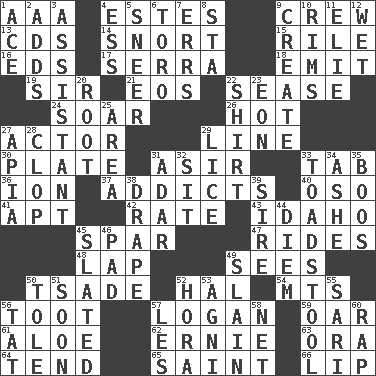 ACROSS 1. American Automobile Association (abbr.) 4. _____ Park, CO 9. Group working together 13. Music discs 14. Derisive sound 15. Cause heat under the collar 16. Begley and Asner 17. Spanish missionary in California 18. Send forth 19. Title for a knight 21. Greek goddess of the dawn 22. Gospel singer Marvin 24. Fly high 26. Being at a high temperature 27. Thespian 29. Actor's bit 30. Food holder 31. SW Saudi Arabia district 33. Bar bill 36. Electrically charged atom 37. Inveterate users 40. Bear (Spanish) 41. Fitting 42. Pace 43. Potato state 45. Coast Guard woman 47. Amusement-park features 48. Pet locale 49. Perceives with the eye 50. Sadhe (variant) 52. Actor Linden 54. Mountains (abbr.) 56. A blast of a horn 57. Utah city north of Ogden 59. Rowing implement 61. Medicinal plant 62. Bert's buddy 63. Mouth or opening 64. Watch over 65. Inhabitant of Heaven 66. Mouth edge DOWN 1. Adept person 2. Does sums 3. Aide 4. Double-curved letter 5. Scornful expression 6. "Corrida" creature 7. Blunders 8. R.R. building 9. Cause to be 10. Basketball hoops 11. Writer Wiesel 12. Soggy 20. Carrot, for example 22. Upper-body garment 23. Age 25. Type of rug 27. Capital of Western Samoa 28. Hoof sound 29. Louse (plural) 31. The sixth month of the Jewish calendar 32. Be seated 33. Inedible or poisonous agaric 34. American tennis player Robert 35. Expressions of contempt or scorn 38. Window treatment 39. Title for a man of rank and authority 44. South Vietnam president (1954) 45. Scheduled 46. Writing tablet 49. Killed 50. Lacquered or enameled metalware 51. Within a short period 52. Israeli folk dance 53. Hindu god of fire 55. Indian skirt 56. Make lace 57. French article 58. Fish or hair follower 60. Strike