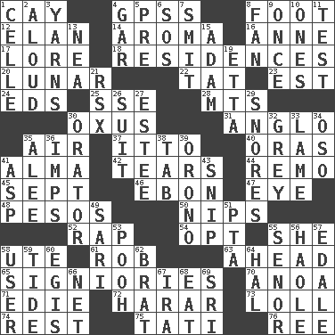 ACROSS 1. Island 4. Global Positioning Systems (abbr.) 8. One third of a yard 12. Flair 14. Odor 16. Singer Murray 17. Old wives' tales, e.g. 18. Homes 20. Type of eclipse 22. Make lace 23. Eastern Standard Time (abbr.) 24. Begley and Asner 25. Compass dir. 28. Mountains (abbr.) 30. The longest river in Central Asia 31. White American of non-Hispanic descent 35. Wind 37. "Tell ____ the Marines!" 40. Mouths or openings 41. _ mater 42. Separates forcefully 44. San ____ (Riviera town) 45. Back-to-school mo. 46. Inky black, to poets 47. Sight organ 48. Mexican monetary units 50. Cuts off 52. Hit sharply and swiftly 54. Elect 55. A female animal or person 58. Shoshoni 61. Director Reiner 63. Having the leading position 65. Seigniories (variant) 70. Small Philippine buffalo 71. Singer Brickell 72. Ethiopian city, capital of Harari 73. Hang loosely or laxly 74. State of inaction 75. Jacques of French films 76. To sift DOWN 1. Cell (Danish) 2. Verbally 3. Entertaining tales 4. Slender fish 5. Before (prefix) 6. Distress signal 7. Stricken, poetically 8. Air blower 9. Single time 10. Washington bills 11. Trial 13. Teachers' org. 15. First man 19. Singer James 21. Acura sports coupe 26. Costume for a special activity 27. First name in cosmetics 29. Sounds asleep 30. Speaker 32. Jennifer or Joel 33. Unable to walk 34. Bear (Spanish) 35. Toward shelter 36. Naughty children 38. Keyboard key 39. U. of Maine site 41. Cleo's killer 43. Sever or remove by pinching or nipping 49. Indian skirt 51. Parent Teacher Association (abbr.) 53. "Silly old bear" 55. Sir (Sp.) 56. White Person, in Hawaii 57. Peak District village in England 58. One who uses or employs something 59. Periodic rise and fall of the sea level 60. The front part of a cuirass 62. Naughty child 64. Actor Linden 66. Fish or hair follower 67. Lyricist Gershwin 68. Ingest 69. _ Lanka