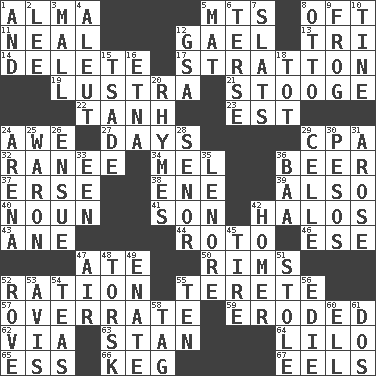 ACROSS 1. _ mater 5. Mountains (abbr.) 8. Often (poetically) 11. Be tempered by heat 12. Highlander 13. Three (prefix) 14. Erase 17. Ski resort town in Vermont 19. A period of five years 21. Moe Howard, for one 22. Hyperbolic tangent 23. Eastern Standard Time (abbr.) 24. Deep reverence 27. 24-hour periods 29. Tax preparer (abbr.) 32. The wife of a rajah (variant) 34. Cartoonist voice _ Blanc 36. Fermented drink made from hops 37. Celtic language 38. Compass dir. 39. In addition 40. Part of speech 41. Male child 42. Radiant circles of light 43. A saturated hydrocarbon 44. Printing process, for short 46. Compass dir. 47. Had dinner 50. Basketball hoops 52. Food allowance for one day 55. Cigar-shaped 57. Make much ado about nothing 59. Worn away 62. By way of 63. Comedian Laurel of Laurel & Hardy 64. _ and Stitch 65. Curvy letter 66. Cask 67. Snakelike fish DOWN 1. Also 2. Area sheltered from the wind 3. Shopping center 4. Eskimo relative 5. Floor protector 6. Laconic 7. Narrow boards 8. Von Bismarck 9. Tree-dwelling hopper 10. Prong on a fork 12. Girls' org. (abbr.) 15. Sadhe (variant) 16. Inactive volcano in Sicily 18. Small child 20. Poems 24. Sports stadium 25. Make _____ (do battle with) 26. Follow as a consequence or result 28. Sir (Sp.) 29. Cell (Danish) 30. Mexican monetary units 31. Came up 33. Car or cant ending 35. Poe poem 36. Sound made by sheep 42. Simpsons dad 45. Hoop that covers a wheel 47. Wind 48. Cod relative 49. Related on the mother's side 51. Fur scarf 52. Be footloose 53. Deliberation 54. Beverages made from leaves 55. "___ Little Indians" 56. Singer Brickell 58. Label 60. Pipe bend 61. Two (Sp.)