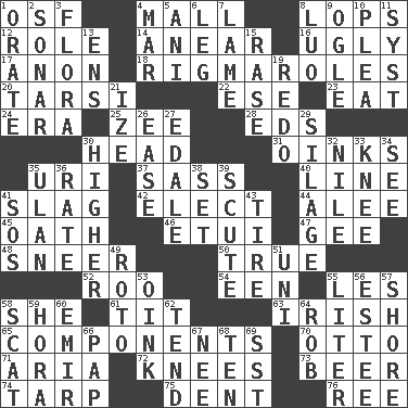 ACROSS 1. Order of Saint Francis (abbr.) 4. Promenade 8. Chops off 12. Hero or heavy, e.g. 14. Approach 16. Unsightly 17. At once, immediately (arch.) 18. Complicated, petty procedures 20. Tarsus (plural) 22. Compass dir. 23. Erode 24. Period 25. Last letter of the English alphabet 28. Begley and Asner 30. Froth on beer 31. Pig sounds 35. RI univ. 37. Backtalk 40. Actor's bit 41. Volcanic refuse 42. Opt 44. Toward shelter 45. Pledge 46. Needle holder 47. Unit of force equal to gravity 48. Scornful expression 50. Loyal 52. Friend of Pooh 54. Car or cant ending 55. French article 58. A female animal or person 61. Teat (slang) 63. From or relating to Ireland 65. Parts 70. "Beetle Bailey" pooch 71. Operatic vocal solo 72. Leg joints 73. Fermented drink made from hops 74. Canvas cover 75. Scratch 76. Portuguese money of account (variant) DOWN 1. Speak pompously 2. Echolocation 3. Plants 4. Impair 5. Cuckoo 6. Part of a journey 7. Unable to walk 8. Nilotic language 9. Stare 10. Entreaty 11. System (abbr.) 13. Followers of ems 15. To erase 19. Do over again 21. Ending with capital 26. Relaxation 27. Peak District village in England 29. Fodder prepared in a silo 30. Having greater elevation 32. The longest river in the world 33. Leg joint 34. Perceive with the eye 35. ____ Bator, Mongolia 36. Assign a rank or rating to 38. Arrange properly for use 39. Scutum 41. Mayday 43. Hoop that covers a wheel 49. Printing process, for short 51. Single; one (prefix) 53. Pig sound 55. 61 cubic inches 56. First name in cosmetics 57. Dinah or Pauly 58. Jazz singing style 59. Israeli folk dance 60. Independent ruler or chieftain 62. Watch over 64. Director Reiner 66. Infant food 67. Born 68. "___ Little Indians" 69. Fast jet (abbr.)
