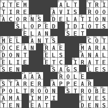 ACROSS 1. A distinct part 5. The first octave above the treble staff 8. Three (prefix) 11. Hoop that covers a wheel 12. Opinion 13. Friend of Pooh 14. Oak nuts 17. Conveyance 19. Inclined 21. Foolish or stupid persons 22. Enthusiasm 23. Arrange properly for use 24. Cartoonist voice _ Blanc 27. Pismires 29. Small bed 32. Sea 34. Actress Charlotte 36. Hindu Mythology: god of death 37. Do not 38. Raised railways 39. Of or related to the anus 40. Writer Wiesel 41. And so on (abbr.) 42. Feeling or showing extreme anger 43. Elected rep. 44. Droops 46. French article 47. American Automobile Association (abbr.) 50. Hero or heavy, e.g. 52. A viewer who gazes fixedly 55. Seem 57. Characterized by complete cowardliness 59. Disco prop 62. Nursemaid (var.) 63. Body of Kaffir warriors 64. Nights before holidays 65. "___ Little Indians" 66. Consume 67. Habitations of wild animals DOWN 1. Call ___ day 2. Nervous spasm 3. Greek god of love 4. Haggard of country music 5. "___ Maria" 6. Ms. Damita and namesakes 7. Sadhe (variant) 8. Musical group of three 9. Carrot, for example 10. Charged particles 12. Say or write further 15. Pitcher Ryan 16. Connect, as a bridge 18. Teat (slang) 20. Main course 24. Methods 25. Learning spot: Fr. 26. Soviet premier 1918-24 28. Table seasonings 29. Lessep's creation 30. Speak pompously 31. Stories 33. Had dinner 35. Fortification 36. Make imperfect 42. Small island 45. Republicans 47. Tate display 48. Nest on high 49. Scent 51. Having ears or earlike features 52. Petty quarrel 53. Heavy book 54. ____ Jay Lerner 55. Black tropical American cuckoo 56. Be footloose 58. Elect 60. Benjamin's nick name 61. Curvy letter