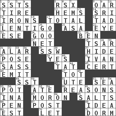 ACROSS 1. Fast planes 5. Acura sports coupe 8. Boat paddle 11. Become fatigued 12. Equivocates 14. _ Lanka 15. Metal shackles 17. "_____ Recall" 18. Bit 19. Small, flat, pigmented spot on the skin 21. White ___ sheet 22. Sight organ 23. Compass dir. 24. Thick or sticky substance 25. Benjamin's nick name 27. Fish or hair follower 28. Russian ruler of old 31. Having or resembling wings 35. Compass dir. 37. Flintstone garb 38. Introduce or present, as a question 39. Affirmative reply 41. "Terrible" tsar 42. Backtalk 43. Make lace 45. Foregone conclusion 46. Send forth 47. Small child 49. Fast jet (abbr.) 51. Shoshoni 52. Ocean 55. Cooking vessel 57. Had dinner 60. Thinks logically 62. _ tizzy (2 wds.) 63. Person of subnormal intelligence 65. Table seasonings 66. Writing instrument 67. Mail 68. The main thing one is thinking about 69. Eastern Standard Time (abbr.) 70. Allow 71. Dormintory (informal) DOWN 1. Vertical member of a panel or frame 2. Founders of families 3. Heavy duty weighing machine 4. Posted 5. 17th letter of the Greek alphabet 6. Stalk of a moss capsule 7. Dec. holiday 8. Clearly or manifestly demonstrative 9. Like ___ of sunshine 10. Travel on an animal 13. Broad, flat, thick piece 16. Attach a signature 17. Tootsie (variant) 20. Travels 26. Principle of right and wrong 29. The sixth month of the Jewish calendar 30. Monthly bill 31. Domed church section 32. Rich soil 33. Aide 34. Musical pauses 36. Soggy 40. Titan orbits this 44. Carry 48. Afternoon social gatherings 50. Pack (down) 52. Twentieth part of a lira 53. Keyboard key 54. Indian state 55. Corncob 56. Singles 58. Implement 59. Celtic language 61. Stated 64. Baseball player Mel
