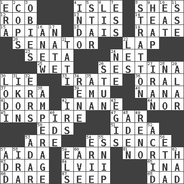 ACROSS 1. Environmental prefix 4. Small island 8. "______ My Girl" (Turtles hit) 12. Director Reiner 13. Nuclear Threat Initiatives 14. Beverages made from leaves 15. Bee-related 18. Raised platform 19. Assign a rank or rating to 20. Legislator 22. Infant locale 23. Bristle 24. Fish or hair follower 25. Soggy 26. French poetic form 30. Untruth 33. Feeling or showing extreme anger 36. Spoken 37. Gumbo ingredient 39. Australian flightless bird 40. Nanny 41. Dormintory (informal) 42. Empty; void 44. And not 45. Motivate 47. Slender fish 50. Begley and Asner 51. It may be bright or harebrained 53. "We ___ not amused" (Victoria) 54. Gist 57. Opera by Verdi 59. Merit 61. _ pole 63. To draw with force 64. 57 in ancient Rome 65. _ tizzy (2 wds.) 66. Have the gumption 67. Ooze 68. June honoree DOWN 1. Period 2. 911 reaches them 3. Off-Broadway awards 4. _ china 5. Play the lead 6. Cards in a Roman deck? 7. Curvy letter 8. Ski resort town in Vermont 9. Pile 10. Erode 11. Compass dir. 16. Afresh 17. Nathan's nickname 21. Jacques of French films 22. French article 24. Born 26. Astound 27. SW Asia republic 28. Billionth: prefix 29. Having or resembling wings 30. Farming town in central California 31. Picture 32. Blunders 34. French philosopher Descartes 35. Housemaid (var.) 38. Electrical Measurement 42. Big collection agency 43. Armor plate that protects the chest 46. Binary compound 48. Arabian gulf 49. Former U.S. Attorney General Janet 52. Bitter 53. The sixth month of the Jewish calendar 54. 4th largest of the Great Lakes 55. Clip 56. Inactive volcano in Sicily 57. Increase 58. Lyricist Gershwin 59. Raised railways 60. "___ Maria" 62. Possessed