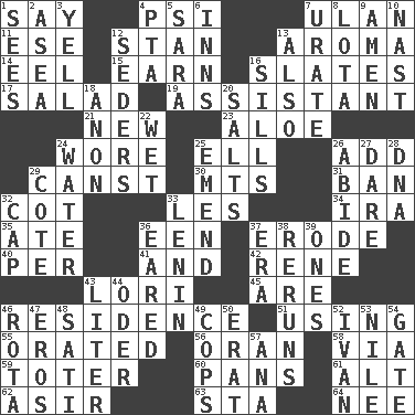 ACROSS 1. Declare 4. Air pressure measure (abbr.) 7. ____ Bator 11. Compass dir. 12. Comedian Laurel of Laurel & Hardy 13. Odor 14. Snakelike fish 15. Merit 16. Chalkboards 17. Vegetable dish 19. Helper 21. ___ Haven, CT 23. Medicinal plant 24. Had on 25. Pipe bend 26. Say or write further 29. 2nd pers. sing. pres. of can (arch.) 30. Mountains (abbr.) 31. Prohibit 32. Small bed 33. French article 34. Retirement account (abbr.) 35. Had dinner 36. Car or cant ending 37. Eat (away) 40. For each 41. Added to 42. French philosopher Descartes 43. Australian parrot (variant) 45. "We ___ not amused" (Victoria) 46. Home 51. Putting into practice 55. Declaimed 56. NW Algerian seaport 58. By way of 59. Carrier 60. Zero-star reviews 61. Keyboard modifier key 62. SW Saudi Arabia district 63. R.R. building 64. Born DOWN 1. Observes 2. At sea 3. Shout 4. Parent Teacher Assoc. 5. "Two Mules for Sister ____" 6. Lodging establishments 7. A salt of uric acid 8. Globular water bottle used in Asia 9. So be it 10. Political cartoonist Thomas 12. Spring feasts 13. In addition 16. Beverly of Met fame 18. At once, immediately (arch.) 20. Table seasonings 22. Soggy 24. Wetness 25. Make improvements or corrections to 26. Remain 27. Have the gumption 28. Heredity factor (abbr.) 29. ____ d'Azur (French Riviera) 32. Head covering 33. Soviet premier 1918-24 36. Having ears or earlike features 37. Period 38. Summer TV shows 39. Singles 43. 61 cubic inches 44. River in Europe 46. Round or rotation of duties 47. Greek god of love 48. Suttee (variant) 49. 911 reaches them 50. Part of Q.E.F. 52. _ the terrible 53. The longest river in the world 54. Yard entry 57. Santa ___, CA