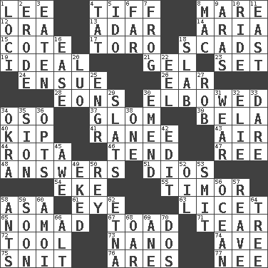 ACROSS 1. Area sheltered from the wind 4. Small quarrel 8. Female horse 12. Mouth or opening 13. The sixth month of the Jewish calendar 14. Roberta Peters solo 15. ____ d'Azur (French Riviera) 17. "Corrida" creature 18. Heaps 19. Standard of perfection 21. Set 23. Arrange properly for use 24. Follow as a consequence or result 26. Ewer handle 28. Immeasurably long periods of time 30. Shoved, as through a crowd 34. Bear (Spanish) 37. Take by theft 39. Actor Lugosi 40. Sleep 41. Indian princess (variant) 43. Atmosphere 44. Round or rotation of duties 46. Look after 47. To sift 48. Responses 51. "Vaya con ____" 54. Make supply last 55. Southeast Indonesia island 58. White ___ sheet 61. Sight organ 63. It is permitted: Lat. 65. Roamer 67. Frog relative 71. Separate forcefully 72. Instrument 73. Billionth: prefix 74. "___ Maria" 75. In a ____ (agitated or irritated) 76. Ancient Greek god of war 77. Born DOWN 1. Locales 2. Eat (away) 3. Consumed 4. Make lace 5. Wedding promise 6. Distant 7. Toadlike animal 8. Big _ 9. Ancient river in northeast Turkey 10. Travel on an animal 11. Compass direction 16. Relaxation 18. Broad, flat, thick piece 20. Nilotic language 22. Snakelike fish 25. Engineer (abbr.) 27. Director Reiner 29. Narrow boards 30. Make improvements or corrections to 31. Put on (as clothing) 32. Writer Wiesel 33. Have the gumption 34. Gumbo ingredient 35. The Jewish people; Israel 36. Elects 38. Single 42. Prepare for publication 45. Deep reverence 49. Made supply last 50. Marina Del _, California 52. Petroleum 53. Stricken, poetically 56. Sea 57. Rob, plunder, or pillage 58. Pismires 59. Within a short period 60. Mine, in Marseilles 62. Inactive volcano in Sicily 64. Woody plant 66. Keyboard modifier key 68. Boat paddle 69. A saturated hydrocarbon 70. Two (Sp.)