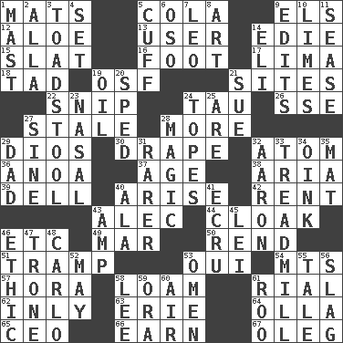 ACROSS 1. Floor protectors 5. Root beer relative 9. Raised railways 12. Medicinal plant 13. One who uses or employs something 14. Singer Brickell 15. Narrow board 16. 12 inches 17. Pale green bean 18. Small amount or degree 19. Order of Saint Francis (abbr.) 21. Locates 22. Sever or remove by pinching or nipping 24. The 19th letter of the Greek alphabet 26. Compass dir. 27. Having lost freshness 28. Greater amount 29. "Vaya con ____" 30. Window treatment 32. Tiny particle 36. Small Philippine buffalo 37. Ripen 38. Roberta Peters solo 39. Small valley 40. Ascend 42. Monthly bill 43. Actor Baldwin 44. Anything that covers or conceals 46. And so on (abbr.) 49. Make imperfect 50. Tear apart 51. _____ steamer (cargo ship) 53. Fr. "Yes" 54. Mountains (abbr.) 57. Israeli folk dance 58. Rich soil 61. Monetary unit of Yemen 62. In an inward manner 63. 4th largest of the Great Lakes 64. Spanish pot 65. Corporate head (abbr.) 66. Merit 67. Cassini of fashion DOWN 1. Vertical spar for supporting sails 2. Silent film actress Nazimova 3. Inedible or poisonous agaric 4. Put into a specified state 5. Sleeve end 6. Bear (Spanish) 7. Lion 8. Nonscientific branch of learning 9. Proofreads 10. Citrus fruits 11. Gospel singer Marvin 14. Connecticut Ivy Leaguer 19. Lubricate 20. Broke a traffic law 21. Take to court 23. Relating to the nose 24. Drinks excessively 25. "We ___ not amused" (Victoria) 27. Trig term 28. Mysterious quality of enchantment 29. June honoree 31. More uncommon 32. Composer Copland 33. Excercise machine 34. Pig sound 35. Floor protector 40. In the manner of 41. Shade of tan 43. Electrical Unit 45. Flowery wreath 46. Principle of right and wrong 47. Heavy duty weighing machine 48. Monte _, Las Vegas Hotel/Casino 52. Can I? 53. Sign of something about to happen 55. Falsehood 56. Volcanic refuse 58. Area sheltered from the wind 59. Mouth or opening 60. Wind 61. Friend of Pooh
