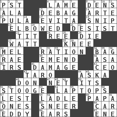 ACROSS 1. Pacific Standard Time (abbr.) 4. Unable to walk 8. Habitations of wild animals 12. In the manner of 13. Debunk (Brit. slang) 14. Johnson of "Laugh-In" 15. Monetary unit of Botswana 17. Webber/Rice musical 18. Clip 19. Shoved, as through a crowd 21. Cease 23. Teat (slang) 24. To sift 26. Expire 27. Electrical Unit 28. Leg joint 30. Cartoonist voice _ Blanc 31. Food allowance for one day 34. Container for groceries 37. Actress Charlotte 38. Make improvements or corrections to 39. White ___ sheet 40. Big collection agency 41. Break 42. Corporate head (abbr.) 43. Pacific island yam 44. "____ silly question..." 46. Spanish title 47. Fish or hair follower 50. ___ a Wonderful Life 51. Moe Howard, for one 54. Portable computers 57. For fear that 58. Dipping utensil 60. Dad 62. Singles 63. Contemptuous expression 64. 4-wheeled motor vehicle 65. Whirlpool 66. Hearing organs 67. Compass dir. DOWN 1. Infant food 2. Change direction abruptly 3. Baron Munchausen's specialties 4. Prying instrument 5. Stay 6. Floor covering 7. Mild oath 8. Hyrax 9. Bert's buddy 10. Nuclear Threat Initiatives 11. Back-to-school mo. 13. Morning condensation 16. "This won't hurt ____!" 20. Baseball player Mel 22. Genesis locale 25. Supplementing with great effort 27. Erode 29. Connecting point 30. Medical imaging device (abbr.) 31. Posterior 32. ID or VA city 33. Beverage made from leaves 34. Keyboard key 35. Toward the sea 36. E Mali city 41. Mild oath, euphamism for damn 43. Tootsie (variant) 44. Small island 45. Discontinue 46. Administered medicine 48. A person who is older than you are 49. Falsehoods 51. A type of plum 52. Be inclined (to) 53. Otherwise 55. For each 56. Connect, as a bridge 59. Santa ___, CA 61. "We ___ not amused" (Victoria)