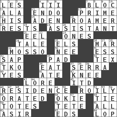 ACROSS 1. French article 4. One more than two 7. Alliance 11. Insect wing 12. Inside; within (prefix) 13. A-one 14. Part of HMS, perhaps 15. An important port of Yemen 16. Nomad 17. Musical pauses 19. Aide 21. Snakelike fish 23. Washington bills 24. Story 25. Raised railways 26. Spoil 29. With motion or animation 30. Born 31. Curvy letter 32. Plant excrement 33. Writing tablet 34. John Ritter's dad 35. Ring climax 36. Erode 37. Father Junipero _ 40. Consenting reply 41. Had dinner 42. Leg joint 43. Old wives' tales, e.g. 45. It would 46. Dwelling 51. Turbulent 55. Spoke pompously 56. Migrant worker of the '30s 58. Standoff 59. Lugs 60. False hair 61. 100% 62. SW Saudi Arabia district 63. Begley and Asner 64. Trim (branches) DOWN 1. Cowardly lion portrayer 2. Writer Wiesel 3. Backtalk 4. Working for oneself (abbr.) 5. The main thing one is thinking about 6. Charged atoms 7. Naughty children 8. Pale green bean 9. Sign of things to come 10. An absolute certainty 12. Artist's stands 13. Airs 16. Wash lightly 18. Beverages made from leaves 20. Having a sole or soles 22. Lion 24. Traditional theme or motif 25. Related on the mother's side 26. Distance measurement (Brit.) 27. Toward the sea 28. Acura sports coupe 29. Create 32. Filthy place 33. Eucharist need 36. Having ears or earlike features 37. What Jean-Claude Killy likes to do 38. Main course 39. Make new 43. 61 cubic inches 44. Lyric poems 46. Round or rotation of duties 47. Greek god of love 48. Suttee (variant) 49. ____ d'Azur (French Riviera) 50. Made supply last 52. Slanted text style (abbr.) 53. _ and Stitch 54. Sharp bark 57. It is