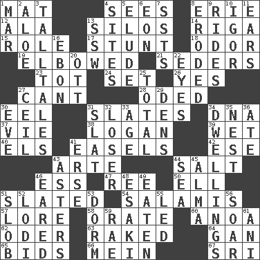 ACROSS 1. Floor covering 4. Observes 8. 4th largest of the Great Lakes 12. Chicken ___ king 13. Grain storage towers 14. Port city in Latvia 15. Hero or heavy, e.g. 17. Check the growth or development of 18. Aroma 19. Shoved, as through a crowd 21. Spring feasts 23. Small child 24. Arrange properly for use 26. Consenting reply 27. Patter 28. Wrote a lyric poem 30. Snakelike fish 31. Chalkboards 34. Heredity factor (abbr.) 37. Compete 38. Utah city north of Ogden 39. Dripping 40. Raised railways 41. Artist's stands 42. Compass dir. 43. Johnson of "Laugh-In" 44. Table seasoning 46. Curvy letter 47. To riddle 50. Pipe bend 51. Scheduled 54. Deli grouping 57. Old wives' tales, e.g. 58. Speak pompously 60. Small Philippine buffalo 62. River in Europe 63. Swept the length of 64. Separate the seeds from cotton 65. Auction offers 66. Chow _ 67. _ Lanka DOWN 1. Spoil 2. Medicinal plant 3. Baron Munchausen's specialties 4. Locates 5. Evade 6. Age 7. Fast planes 8. Eaten away 9. Amusement-park features 10. Russian composer Stravinsky 11. Hearing organs 13. Compass dir. 16. Inky black, to poets 20. Baseball player Mel 22. Snake ____ (dice throw) 25. Add up to 27. To provide with a ceiling 29. Lairs 30. First lady 31. Narrow board 32. Failure 33. Mature 34. Residences 35. Egg locale 36. Had dinner 41. Celtic language 43. Michaelmas daisies 44. Ocean 45. _ mater 46. Having ears or earlike features 48. 1973 Nobel Price Winner (Physics) Leo 49. Eroded 51. Messy guy 52. Farming town in central California 53. Dormintory (informal) 55. Directed 56. Fly high 59. Actress Charlotte 61. Black tropical American cuckoo