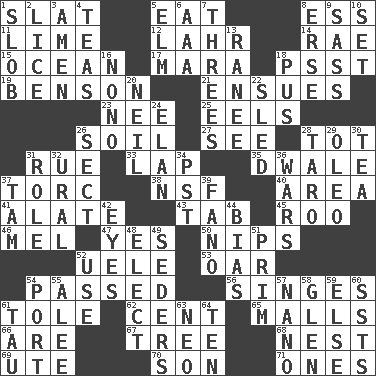 ACROSS 1. Narrow board 5. Consume 8. Curvy letter 11. Welles in "The Third Man" 12. Cowardly lion portrayer 14. Actress Charlotte 15. Sea 17. Hindu Mythology: god of death 18. Inconspicuous attention getter 19. Gillaume's butler role 21. Follows as a consequence or result 23. Born 25. Snakelike fish 26. The visible part of the earth's surface 27. Observe 28. Small child 31. Regret 33. Pet locale 35. A sleeping potion; an opiate (poet.) 37. Torque (variant) 38. Overdraft (abbr.) 40. Length times width 41. Having winglike extensions 43. Keyboard key 45. Friend of Pooh 46. Cartoonist voice _ Blanc 47. Consenting reply 50. Cuts off 52. Ubangi River tributary 53. Boat paddle 54. Went by 56. Scorches 61. Lacquered or enameled metalware 62. Penny 65. Promenades 66. "We ___ not amused" (Victoria) 67. Family _ (genealogy) 68. Egg locale 69. Shoshoni 70. Male offspring 71. Washington bills DOWN 1. Messy guy 2. Louse (plural) 3. So be it 4. Beverages made from leaves 5. Shade tree 6. Auto club (abbr.) 7. Trios 8. Celtic language 9. Backtalk 10. Arrange properly for use 13. Indian princess (variant) 16. Words to Nanette 18. Fluid product of inflammation 20. Famous astronaut Armstrong 22. Downhill vehicle 24. Style 26. Religious group 28. Edible starchy tuberous root 29. Margarine 30. Afternoon social gathering 31. Hero or heavy, e.g. 32. Mountain range 34. Pacific Standard Time (abbr.) 36. Armed conflicts 37. Scottish cap 39. Papal veil 42. Snake ____ (dice throw) 44. Prejudice 48. Opt 49. Spring feasts 51. Demure 52. Purpose 54. Sweet dark-red dessert wine 55. Toward shelter 57. Billionth: prefix 58. Small, secluded valley 59. Otherwise 60. Fast planes 61. The 19th letter of the Greek alphabet 63. Modern: prefix 64. Nine, plus one