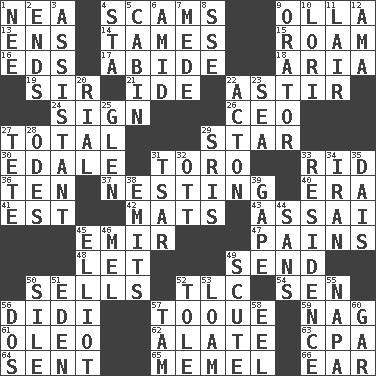 ACROSS 1. Teachers' org. 4. Fraudulent business schemes 9. Water jar 13. Followers of ems 14. Corrects by punishment or discipline 15. Wander aimlessly 16. Begley and Asner 17. Remain 18. Operatic vocal solo 19. Title for a knight 21. Binary compound 22. Having gotten out of bed 24. Signal 26. Corporate head (abbr.) 27. "_____ Recall" 29. Play the lead 30. Peak District village in England 31. "Corrida" creature 33. To free from 36. "___ Little Indians" 37. Snuggling 40. Period 41. Eastern Standard Time (abbr.) 42. Floor protectors 43. Slender Brazilian palm 45. Independent ruler or chieftain 47. Aches 48. Allow 49. Transmit 50. Makes a sale 52. Affectionate concern, for short 54. Elected rep. 56. "You Light Up My Life" star Conn 57. Woman's close-fitting hat 59. Tired old horse 61. Butter sub 62. Having winglike extensions 63. Accounting whiz (abbr.) 64. Transmitted 65. Klaipeda city 66. Hearing organ DOWN 1. Born 2. Extremities 3. Helper 4. R.R. building 5. Small house or cottage 6. Among 7. Ancient Persian 8. Compass dir. 9. Speaker 10. Australian parrot (variant) 11. Den 12. Housemaid (var.) 20. Monetary unit of Yemen 22. NE Massachussets city 23. Ocean 25. Small, secluded valley 27. False hair 28. Lyric poems 29. Indian titles of respect 31. Russian ruler of old 32. Baseball player Mel 33. Dwelling 34. SW Asia republic 35. Raised platform 38. Sends forth 39. Yawn 44. Without 45. American author Paul (1891-1958) 46. Cartoonist voice _ Blanc 49. Turtle shell scale 50. Filth; sediment 51. Genesis locale 52. Lacquered or enameled metalware 53. Rich soil 55. California wine valley 56. Two (Sp.) 57. Scottish cap 58. Snakelike fish 60. Slender fish