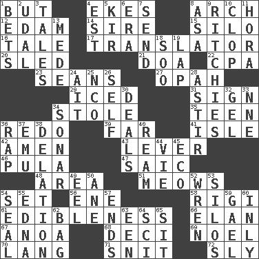 ACROSS 1. With the exception that 4. Supplements with great effort 8. Bowlike part 12. Dutch treat 14. Beget 15. Grain storage tower 16. Lie 17. Interpreter 20. Downhill vehicle 21. ___ good deed 22. Numbers guy (abbr.) 23. Actors Connery and Penn 27. Brightly colored fish 29. On the rocks 31. Attach a signature 34. Took without asking 35. Adolescent 36. Redecorate 39. At a great distance 41. Capri or Wight 42. So be it 43. Prying instrument 46. Monetary unit of Botswana 47. Ketch in the Levant 48. Length times width 51. Catcalls? 54. Put into a specified state 56. Compass dir. 58. Swiss mountan, "Queen of the Mountains" 61. The property of being fit to eat 66. Enthusiasm 67. Small Philippine buffalo 68. Tenth: prefix 69. Christmas carol 70. Long (Scottish) 71. In a ____ (agitated or irritated) 72. Insidious DOWN 1. Wagers 2. Hereditary estate 3. Falsehoods 4. Eastern Standard Time (abbr.) 5. Apertif with cassis 6. Period 7. Post 8. White ___ sheet 9. Actors Guy, Robert Welles, and Clint 10. Hoof sound 11. Israeli folk dance 13. Ancient Persian 18. "Barney Miller" actor Jack 19. Infant locale 24. Small island 25. Non-commissioned officer (abbr.) 26. Itself 28. Moving or stirring 30. Allots cards 32. Set 33. Compass dir. 34. Underwater navigation system 36. Hit sharply and swiftly 37. Australian flightless bird 38. Accusation by an informer 40. 480, 500 or 516 sheets of paper 44. Compete 45. Environmental prefix 49. Snakelike fish 50. One (Scot) 52. Songbird 53. Grain storage towers 54. Lick closed 55. Pulitzer Prize-winning author Ferber 57. Extremities 59. Highlander 60. Inwardly 62. Container for groceries 63. Car or cant ending 64. _-fi 65. Be seated