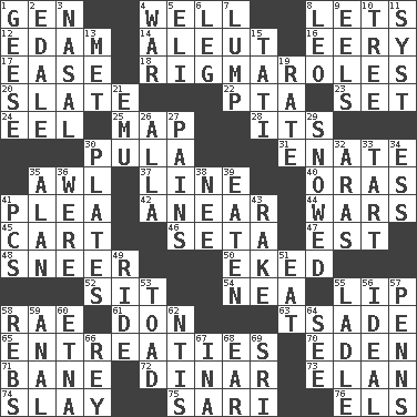ACROSS 1. Commissioned mil. rank 4. Water source 8. Allows 12. Dutch treat 14. Native American of Southwest Alaska 16. Suggestive of the supernatural 17. Relaxation 18. Frustrating wastes of time 20. Schedule 22. Parent Teacher Association (abbr.) 23. Arrange properly for use 24. Snakelike fish 25. Atlas unit 28. It is 30. Monetary unit of Botswana 31. Maternal 35. Leather borer 37. Actor's bit 40. Mouths or openings 41. Entreaty 42. Approach 44. Armed conflicts 45. Heavy open wagon 46. Stalk of a moss capsule 47. Eastern Standard Time (abbr.) 48. Scornful expression 50. Supplemented with great effort 52. Be seated 54. Teachers' org. 55. Mouth edge 58. Actress Charlotte 61. Spanish title 63. Sadhe (variant) 65. Pleas 70. Paradise 71. Object of repulsion 72. Middle Eastern gold or silver currency 73. Style 74. Kill 75. Indian skirt 76. Raised railways DOWN 1. Honkers 2. Peak District village in England 3. Relating to the nose 4. Armed conflict 5. Biblical high priest 6. Part of a journey 7. Mass 8. Lion 9. Snakelike fish 10. Relationship diagram 11. System (abbr.) 13. Was introduced to 15. Jacques of French films 19. Pace 21. Australian flightless bird 26. Silent film actress Nazimova 27. Aches 29. Overwhelmed 30. Food holders 32. Ancient river in northeast Turkey 33. Small pie 34. Curvy letter 35. ____ Jay Lerner 36. Past tense of be (plural) 38. Born 39. Consumed 41. Personal Computers (abbr.) 43. Immoral or dissolute person 49. Travel on an animal 51. Ingest 53. Frog relative 55. Dipping utensil 56. Perfect 57. Actor Sean's family 58. Confederate soldiers (slang) 59. Of or related to the anus 60. Inactive volcano in Sicily 62. Nuclear Threat Initiatives 64. Observe 66. Marina Del _, California 67. _ tizzy (2 wds.) 68. Hearing organ 69. _ Lanka