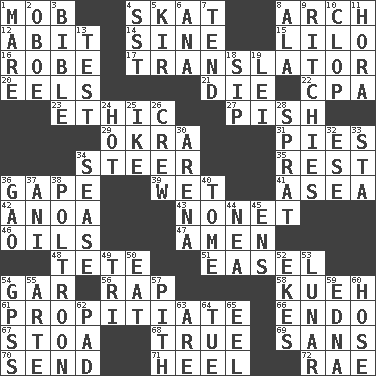 ACROSS 1. Disorderly crowd 4. Three-handed card game 8. Bowlike part 12. "This won't hurt ____!" 14. Trig term 15. _ and Stitch 16. Loose flowing garment 17. Interpreter 20. Snakelike fish 21. Pass on 22. Accounting whiz (abbr.) 23. Value system 27. Expression of disdain 29. Gumbo ingredient 31. Sliced desserts 34. Navigate 35. Relief 36. Stare wonderingly 39. Dripping 41. Toward the sea 42. Small Philippine buffalo 43. Music written for nine 46. Petroleums 47. So be it 48. Wig 51. Artist's stand 54. Slender fish 56. Hit sharply and swiftly 58. Malaysian steamed pastry 61. Conciliate 66. Inside; within (prefix) 67. Portico 68. Loyal 69. Without 70. Post 71. The bottom of a shoe or boot 72. Actress Charlotte DOWN 1. Female horse 2. Mitch Miller's instrument 3. God's Word 4. Fast jet (abbr.) 5. Apertif with cassis 6. Santa ___, CA 7. Be inclined (to) 8. Chicken ___ king 9. Actors Guy, Robert Welles, and Clint 10. Hoof sound 11. Israeli folk dance 13. Trial 18. Small drink 19. Luau accessory 24. Being at a high temperature 25. Eisenhower's nickname 26. Group working together 28. Small fatty European fish 30. Sports stadium 32. Compass dir. 33. R.R. building 34. Gospel singer Marvin 36. E Mali city 37. Black tropical American cuckoo 38. Characterized by complete cowardliness 40. Heavy book 44. Teachers' org. 45. Followers of ems 49. Three (prefix) 50. Consume 52. Supplements with great effort 53. Type of eclipse 54. Global Positioning Systems (abbr.) 55. Johnson of "Laugh-In" 57. Heart or essence 59. Pulitzer Prize-winning author Ferber 60. Flexible conduit 62. Groovy apt. 63. "We ___ not amused" (Victoria) 64. Third day of the wk. 65. Snakelike fish
