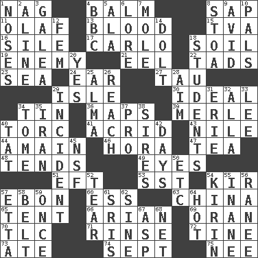 ACROSS 1. Tired old horse 4. Lip ointment 8. Plant excrement 11. Norwegian king 13. Vital fluid 15. Federal power corp. 16. Filth; sediment 17. Monte _, Las Vegas Hotel/Casino 18. Land 19. Foe 21. Snakelike fish 22. Small amounts or degrees 23. Ocean 24. Ewer handle 27. The 19th letter of the Greek alphabet 29. Capri or Wight 30. Standard of perfection 34. Metal container 36. Atlas contents 39. Haggard of country music 40. Torque (variant) 41. Bitter 43. "Death on the ____" 44. At full speed 46. Israeli folk dance 47. Afternoon social gathering 48. Looks after 49. Snake ____ (dice throw) 51. Bank Draft (abbr.) 53. Fast jet (abbr.) 54. Apertif with cassis 57. Inky black, to poets 60. Curvy letter 63. Large country 65. Portable shelter 66. Believer in; advocate of (suffix) 69. NW Algerian seaport 70. Affectionate concern, for short 71. Remove soap 72. Prong on a fork 73. Had dinner 74. Back-to-school mo. 75. Born DOWN 1. Olfactory organs 2. Place in a line 3. An organ shaped like a helmet 4. English channel? 5. According to 6. Old wives' tales, e.g. 7. Undercover agent 8. Portico 9. Enthusiastic 10. Friends 12. Opposite of masc. 14. Dunce 18. SAT takers 20. Consenting reply 25. _ mater 26. Arrive at 28. Direct toward a target or goal 29. Happening 31. One of the Great Lakes 32. Silent film actress Nazimova 33. Area sheltered from the wind 34. Heavy book 35. SW Asia republic 37. Adept person 38. Founders of families 40. Make lace 42. 24-hour periods 45. Overdraft (abbr.) 50. And so on (abbr.) 52. Pull apart 54. Japanese brewing company 55. Lacking in sense or substance 56. The wife of a rajah (variant) 57. Singer James 58. Waist strap 59. Single time 61. Indian titles of respect 62. Trig term 64. Being at a high temperature 67. Cleo's killer 68. Fish or hair follower