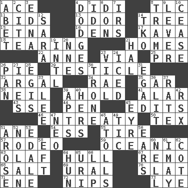 ACROSS 1. Adept person 4. "You Light Up My Life" star Conn 8. Affectionate concern, for short 11. Auction offers 13. Scent 14. Family _ (genealogy) 15. Inactive volcano in Sicily 16. Cub Scout units 17. Polynesian shrub of the pepper family 18. Pulling into pieces 21. Residences 22. Queen of England 1702-14 23. By way of 25. Before (prefix) 26. Sliced dessert 29. One of the two male reproductive glands 32. Therefore, facetiously 34. Actress Charlotte 35. Slender fish 38. Famous astronaut Armstrong 39. Hold, grip (Informal) 41. Having or resembling wings 43. Compass dir. 44. Animal enclosure 45. Prepares for publication 46. Plea 50. John Ritter's dad 51. A saturated hydrocarbon 54. Curvy letter 55. Become fatigued 57. Cowboy competition 59. Pertaining to the sea 63. Norwegian king 64. Frame or body of a ship 67. San ____ (Riviera town) 68. Table seasoning 69. Mountain range 70. Narrow board 71. Compass dir. 72. Pinches, bites 73. Sodium hydroxide DOWN 1. Collude with 2. Quote 3. Pulitzer Prize-winning author Ferber 4. Evades 5. Binary compound 6. Spanish title 7. Big collection agency 8. _____ steamer (cargo ship) 9. Prying instrument 10. Stop 12. "Two Mules for Sister ____" 14. Ring climax 19. International (abbr.) 20. Compass dir. 21. Actor Linden 23. Small bottle 24. On the rocks 26. Baking dish 27. Angers 28. Armor plate that protects the chest 30. Heavy duty weighing machine 31. Mild oath 33. Toward shelter 36. Set down 37. Assign a rank or rating to 39. Tenement units (abbr.) 40. Possessive pronoun 42. Acura sports coupe 45. Jane of fiction 47. Modern: prefix 48. Ringlike coral islands and reefs 49. Nervous spasm 51. Came up 52. Pitcher Ryan 53. Peak District village in England 56. Hearing organs 58. Lizard (obsolete) 60. 1994 drama film starring Jodie Foster 61. "If ____ say so..." 62. ____ d'Azur (French Riviera) 64. Attila the _ 65. RI univ. 66. Infant locale