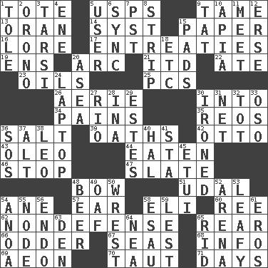 ACROSS 1. Haul 5. United States Postal Service (abbr.) 9. Not wild 13. NW Algerian seaport 14. System (abbr.) 15. Some stationery 16. Old wives' tales, e.g. 17. Pleas 19. Followers of ems 20. Curve 21. It would 22. Had dinner 23. Lubricates 25. Personal Computers (abbr.) 26. Nest on high 30. To the inside or interior of 34. Aches 35. Vintage cars 36. Table seasoning 39. Profane or obscene expressions 42. "Beetle Bailey" pooch 43. Butter sub 44. Eroded 46. Halt 47. Schedule 48. Ribbon knot 51. Freehold land 54. A saturated hydrocarbon 57. Hearing organ 58. Biblical high priest 60. To separate or throw off 62. Unrelated to defense, as in spending 65. Located in or toward the back 66. More peculiar 67. Oceans 68. Information 69. Period of immesurable duration 70. Pulled tight 71. 24-hour periods DOWN 1. Lacquered or enameled metalware 2. U. of Maine site 3. Tarsus (plural) 4. Compass dir. 5. One who uses or employs something 6. Synchronize (abbr.) 7. Pacific Standard Time (abbr.) 8. Empty completely 9. Make lace 10. Capital of Western Samoa 11. Rendezvous 12. Celtic language 15. Groovy apts. 18. And so on (abbr.) 20. At sea 24. Portable computer 27. _ de Janeiro 28. _ tizzy (2 wds.) 29. _____ Park, CO 30. Pressed 31. Fish or hair follower 32. Small child 33. Bear (Spanish) 36. Distress signal 37. The first octave above the treble staff 38. Lion 40. Actor Linden 41. R.R. building 45. Needle case 48. Fermented drink made from hops 49. Clumsy lout 50. Obtain by seizing forcibly or violently 52. Sports stadium 53. Like summer trees 54. Small Philippine buffalo 55. Thickened enlargement 56. Inside; within (prefix) 58. Son of Isaac 59. For fear that 61. Greek god of love 63. Lair 64. Teachers' org. 65. To free from