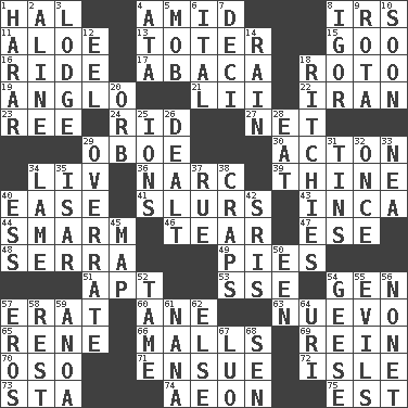ACROSS 1. Actor Linden 4. Among 8. Big collection agency 11. _ vera 13. Carrier 15. Thick or sticky substance 16. Travel on an animal 17. Phillipine bananalike plant 18. Printing process, for short 19. White American of non-Hispanic descent 21. Cards in a Roman deck? 22. SW Asia republic 23. To sift 24. To free from 27. Fish or hair follower 29. Mitch Miller's instrument 30. NE Massachussets city 34. 54 in ancient Rome 36. Drug cop 39. One or ones belonging to thee 40. Relaxation 41. Plays smoothly or legato 43. South American Indian 44. Excessive but superficial compliments 46. Pull into pieces 47. Compass dir. 48. Father Junipero _ 49. Sliced desserts 51. Fitting 53. Compass dir. 54. Commissioned mil. rank 57. Part of Q.E.F. 60. One (Scot) 63. New (sp.) 65. French philosopher Descartes 66. Shopping centers 69. It's straight from the horse's mouth 70. Bear (Spanish) 71. Follow as a consequence or result 72. Capri or Wight 73. R.R. building 74. Period of immesurable duration 75. Eastern Standard Time (abbr.) DOWN 1. Ethiopian city, capital of Harari 2. Place in a line 3. Cabin 4. _ moment's notice (2 wds.) 5. Disorderly crowd 6. Slanted text style (abbr.) 7. Tenth: prefix 8. Composer Stravinsky 9. Round or rotation of duties 10. Within a short period 12. Snakelike fish 14. Water falling in drops from the sky 18. Actors Guy, Robert Welles, and Clint 20. Globe 25. Charged particles 26. Started a card game 28. Consume 29. Make much ado about nothing 31. Metal containers 32. At one time in the past 33. Teachers' org. 34. Unable to walk 35. Austrian river, tributary to the Danube 37. Regret 38. Dice game 40. Double-curved letter 42. Indian titles of respect 45. Atlas unit 50. Car or cant ending 52. Docile 54. Honkers 55. Vices 56. Music written for nine 57. Greek god of love 58. Remainder 59. Small Philippine buffalo 61. Grandmother 62. Otherwise 64. RI univ. 67. Nilotic language 68. Elected rep.