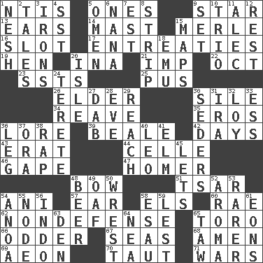 ACROSS 1. Nuclear Threat Initiatives 5. Singles 9. Play the lead 13. Hearing organs 14. Vertical spar for supporting sails 15. Haggard of country music 16. Slit 17. Pleas 19. Layer 20. _ tizzy (2 wds.) 21. Mischievous child 22. Sep. follower 23. Fast planes 25. Fluid product of inflammation 26. A person who is older than you are 30. Drop; flow; fall 34. Rob, plunder, or pillage 35. Greek god of love 36. Old wives' tales, e.g. 39. Calif. Air Force Base 42. 24-hour periods 43. Part of Q.E.F. 44. Cell (Danish) 46. Yawn 47. Baseball hit which scores a run 48. Ribbon knot 51. Russian ruler of old 54. Black tropical American cuckoo 57. Ewer handle 58. Raised railways 60. Actress Charlotte 62. Unrelated to defense, as in spending 65. "Corrida" creature 66. More peculiar 67. Oceans 68. So be it 69. Period of immesurable duration 70. Pulled tight 71. Armed conflicts DOWN 1. Tender 2. Falsehoods 3. Metal shackles 4. Fast jet (abbr.) 5. Presage 6. Grandmother 7. Eastern Standard Time (abbr.) 8. Empty completely 9. Arrange properly for use 10. Musical group of three 11. Actor Baldwin 12. Respite 15. Atlas contents 18. Australian flightless bird 20. Small island 24. Cylindrical with tapered ends 27. Apply (a substance) by light strokes 28. First lady 29. Arrive at 30. Spring feasts 31. Lyricist Gershwin 32. Myrna of the movies 33. Curvy letter 36. Part of a journey 37. Mouth or opening 38. Reproach for some lapse or misdeed 40. Lion 41. Shade tree 45. Allows 48. Fermented drink made from hops 49. Clumsy lout 50. Take or capture by force 52. Scent 53. More uncommon 54. Small Philippine buffalo 55. Connecting point 56. Southeast Asian peninsula 58. Son of Isaac 59. For fear that 61. Immeasurably long periods of time 63. Lair 64. Teachers' org. 65. The 23rd letter of the Hebrew alphabet
