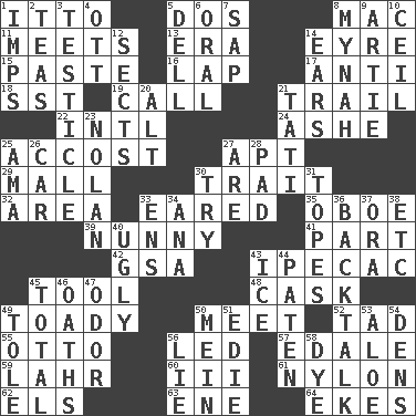 ACROSS 1. "Tell ____ the Marines!" 5. Two (Sp.) 8. Apple computer (short form) 11. Confronts 13. Period 14. Jane of fiction 15. Thick mixture 16. Infant locale 17. Opposed to 18. Fast jet (abbr.) 19. Give a ring to 21. Lag or linger behind 22. International (abbr.) 24. American tennis player Robert 25. Buttonhole 27. Fitting 29. Promenade 30. Distinguishing feature 32. Type of rug 33. Having ears or earlike features 35. Mitch Miller's instrument 39. Pet term 41. Component 42. Girls' org. (abbr.) 43. Medicinal drug used to evoke vomiting 45. Utensil 48. Keg 49. Sycophant 50. Confront 52. Small boy 55. Von Bismarck 56. Directed 57. Peak District village in England 59. Cowardly lion portrayer 60. One more than two 61. Thermoplastic polyamide 62. Raised railways 63. Compass dir. 64. Supplements with great effort DOWN 1. Naughty children 2. Afternoon social gatherings 3. A testis 4. Baseball player Mel 5. Small valley 6. Of the mouth 7. Plant excrement 8. Non-adult bird? 9. Nick name for Arthur 10. To provide with a ceiling 12. Religious groups 14. Hearing organs 20. Keyboard modifier key 21. Jacques of French films 23. Pitcher Ryan 25. Wet nurse (var.) 26. Auto 27. "We ___ not amused" (Victoria) 28. Groovy apt. 30. Attempt to accomplish something 31. Drinks excessively 33. Followers of ems 34. Santa ___, CA 36. Sass 37. Mouth or opening 38. And so on (abbr.) 40. Unsightly 43. Frozen water 44. Eucharist need 45. Add up to 46. Curses 47. Scent 49. Lacquered or enameled metalware 50. Count _ (2 wds.) 51. Singer Brickell 53. _ vera 54. Cub Scout units 56. Untruth 58. Color