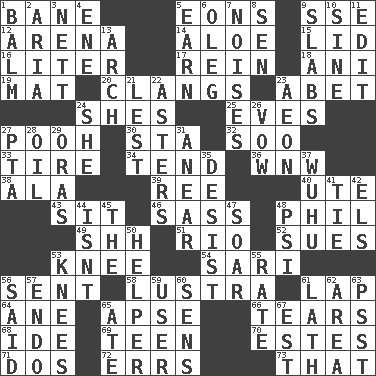 ACROSS 1. Object of repulsion 5. Immeasurably long periods of time 9. Compass dir. 12. Sports stadium 14. Medicinal plant 15. Flaplike covering 16. 61 cubic inches 17. It's straight from the horse's mouth 18. Cuckoo 19. Floor covering 20. Rings like a ship's bell 23. Collude with 24. "______ My Girl" (Turtles hit) 25. Nights before holidays 27. "Silly old bear" 30. R.R. building 32. "Barney Miller" actor Jack 33. Become fatigued 34. Look after 36. Compass dir. 38. Wing 39. Portuguese money of account (variant) 40. Shoshoni 43. Be seated 46. Backtalk 48. Silvers or Donahue 49. Quiet! 51. River (Sp.) 52. Institutes legal proceedings 53. Leg joint 54. Indian skirt 56. Emitted 58. A period of five years 61. Infant locale 64. One (Scot) 65. Domed church section 66. Pulls apart 68. Binary compound 69. Adolescent 70. _____ Park, CO 71. Two (Sp.) 72. Blunders 73. Not this but _ DOWN 1. Lip ointment 2. Operatic vocal solo 3. Remaining after all deductions 4. Compass dir. 5. Merit 6. Cassini of fashion 7. Annoying sounds 8. Elected rep. 9. Thick slices 10. Trig term 11. Prepare for publication 13. Bowlike part 21. For fear that 22. Michaelmas daisies 23. Age 24. A female animal or person 26. Promise 27. Parent Teacher Assoc. 28. Lubricate 29. Mouths or openings 31. Approach 35. Cease 37. Chinese city south-southwest of Nanjing 41. Make a knot 42. Raised railways 44. Is not 45. Definite Article 47. Fly high 48. Air pressure measure (abbr.) 50. Assistant 53. Leg joints 55. Assign a rank or rating to 56. Stated 57. Inside; within (prefix) 59. One who makes use of a thing 60. Elected reps. 61. Thin strip of wood or metal 62. Type of rug 63. Inconspicuous attention getter 65. Had dinner 67. Eastern Standard Time (abbr.)