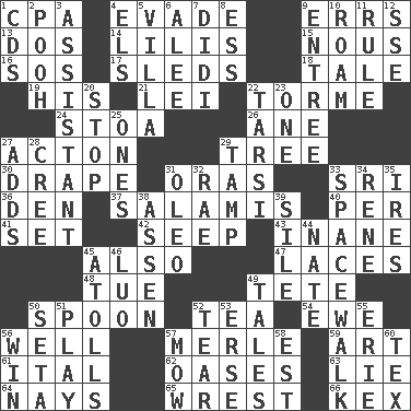 ACROSS 1. Accounting whiz (abbr.) 4. Elude 9. Blunders 13. Two (Sp.) 14. Ms. Damita and namesakes 15. Horse sense 16. Mayday 17. Bobsleighs 18. Falsehood 19. Part of HMS, perhaps 21. Luau accessory 22. Singer Mel 24. Portico 26. A saturated hydrocarbon 27. Gambison 29. Relationship diagram 30. Window treatment 31. Mouths or openings 33. Indian title of respect (Mr.) 36. Lair 37. Deli grouping 40. For each 41. Put into a specified state 42. Ooze 43. Silly 45. In addition 47. Shoestrings 48. Third day of the wk. 49. Wig 50. Soup utensil 52. Afternoon social gathering 54. She-sheep 56. Water source 57. Haggard of country music 59. Nonscientific branch of learning 61. Slanted text style (abbr.) 62. Fertile tracts in a desert 63. Falsehood 64. Negative votes 65. Take or capture by force 66. Dry husk or covering DOWN 1. Music discs 2. "Silly old bear" 3. Aide 4. Raised railways 5. Country residence 6. Toward shelter 7. "You Light Up My Life" star Conn 8. Double-curved letter 9. Main course 10. Wander aimlessly 11. Court order 12. Compass dir. 20. Constrict 22. Tarsus (plural) 23. Single 25. Washington bills 27. Does sums 28. Algonquian 29. Pack (down) 31. Butter sub 32. Actress Charlotte 33. High altitude stroll 34. French philosopher Descartes 35. Angers 38. NE Netherlands city 39. Filth; sediment 44. Nathan's nickname 45. Ringlike coral islands and reefs 46. Nilotic language 49. Lies 50. Stalk of a moss capsule 51. Romp 52. Pull into pieces 53. Celtic language 55. One of the Great Lakes 56. Victory 57. Cut the grass 58. Eastern Standard Time (abbr.) 60. John Ritter's dad