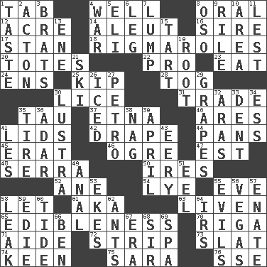 ACROSS 1. Bar bill 4. Not ill 8. Spoken 12. 43,560 square feet 14. Native American of Southwest Alaska 16. Male parent of an animal 17. Comedian Laurel of Laurel & Hardy 18. Frustrating wastes of time 20. Lugs 22. Adept person 23. Ingest 24. Followers of ems 25. Monetary unit of Laos 28. Coat; cloak 30. Louse (plural) 31. Buy and sell 35. The 19th letter of the Greek alphabet 37. Inactive volcano in Sicily 40. Ancient Greek god of war 41. Hats (slang) 42. Window treatment 44. Baking dishes 45. Part of Q.E.F. 46. Legendary monster 47. Eastern Standard Time (abbr.) 48. Father Junipero _ 50. Angers 52. One (Scot) 54. Potassium hydroxide 55. First lady 58. Allow 61. Alias (abbr.) 63. Make or become more lively 65. The property of being fit to eat 70. Capital of Latvia 71. Assistant 72. Empty completely 73. Narrow board 74. Peachy ____! 75. "Two Mules for Sister ____" 76. Compass dir. DOWN 1. Clothes sense 2. NE Massachussets city 3. Naughty children 4. Armed conflict 5. Connecticut Ivy Leaguer 6. Part of a journey 7. Mass 8. Bear (Spanish) 9. Cause heat under the collar 10. Type of rug 11. For fear that 13. Compass dir. 15. Small pie 19. Carrot, for example 21. What Jean-Claude Killy likes to do 26. On the rocks 27. Stone: prefix 29. Wine fruits 30. A period of five years 32. Caspian sea tributary 33. Scratch 34. Curvy letter 35. Become fatigued 36. The sixth month of the Jewish calendar 38. Tired old horse 39. Showery time 41. French article 43. Suggestive of the supernatural 49. Of or related to the anus 51. Snakelike fish 53. Supplements with great effort 55. Vices 56. Viva Las _ 57. Maternal 58. Path through which fluid escapes 59. Singer Brickell 60. Event that recurs at intervals 62. Pismires 64. Big collection agency 66. Benjamin's nick name 67. Period 68. Title for a knight 69. Health resort