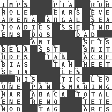 ACROSS 1. Naughty children 5. Parent Teacher Association (abbr.) 8. Director Reiner 11. Hero or heavy, e.g. 12. Hearing organs 14. Night before a holiday 15. Sports stadium 17. Therefore, facetiously 18. Ocean 19. Sycophants 21. Compass dir. 22. Working for oneself (abbr.) 23. Followers of ems 24. Two (Sp.) 25. Male parent 27. Cuckoo 28. Puts into a specified state 31. Actor Lugosi 35. Fast jet (abbr.) 37. In a ____ (agitated or irritated) 38. Lyric poems 39. Bar bill 41. 1/640 square mile 42. Prejudice 43. Scottish cap 45. Confront 46. Bristle 47. French article 49. Part of HMS, perhaps 51. Nervous spasm 52. Lion 55. Single 57. Baking dish 60. Catching in a trap 62. Third mo. 63. Phillipine bananalike plant 65. Add up to 66. Compass dir. 67. Western Nevada city 68. False hair 69. Dreamland 70. Label 71. Ancient Greek god of war DOWN 1. Feeling or showing extreme anger 2. Person of subnormal intelligence 3. Entreaties 4. Transmit 5. For each 6. Labels 7. Caspian sea tributary 8. Home 9. Baking chamber 10. Necklace unit 13. Downhill vehicle 16. Opera by Verdi 17. Help 20. Immeasurably long periods of time 26. Indian state 29. Become fatigued 30. Proofreading order 31. Moves up and down 32. Singer Brickell 33. Tough but pliablecoriaceous 34. Slender Brazilian palm 36. Make lace 40. Greek mezzo-soprano Agnes 44. Chow _ 48. Get outta here! 50. Coast Guard woman 52. 61 cubic inches 53. Related on the mother's side 54. Stares at amorously 55. Sign of something about to happen 56. Billionth: prefix 58. Collude with 59. Nanny 61. Roll call or roster of names 64. Gear tooth