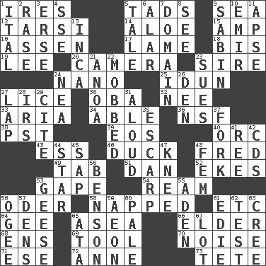 ACROSS 1. Angers 5. Small boys 9. Ocean 12. Tarsus (plural) 14. _ vera 15. Electrical Unit 16. NE Netherlands city 17. Unable to walk 18. Altar cloth linen 19. Area sheltered from the wind 20. Device for capturing images 23. Male parent of an animal 24. Billionth: prefix 25. Goddess of spring and wife of Bragi 27. Louse (plural) 30. Chief or king in Benin or Nigeria 32. Born 33. Roberta Peters solo 34. Competent 36. Overdraft (abbr.) 38. Pacific Standard Time (abbr.) 39. Greek goddess of the dawn 40. The grampus (Milton) 43. Curvy letter 46. Evade 48. Flintstone 49. Keyboard key 51. Daniel's nick name 52. Supplements with great effort 53. Stare wonderingly 54. 480, 500 or 516 sheets of paper 56. River in Europe 58. Slept 61. And so on (abbr.) 64. Unit of force equal to gravity 65. At sea 66. A person who is older than you are 68. Followers of ems 69. Utensil 70. Annoying sound 71. Compass dir. 72. Singer Murray 73. False hair DOWN 1. Slanted text style (abbr.) 2. To erase 3. Celtic language 4. Compass dir. 5. Story 6. Having or resembling wings 7. Kingdom 8. Perceive with the eye 9. Unit of acoustic absorption 10. Independent ruler or chieftain 11. Domed church section 13. South American Indian 21. Small Philippine buffalo 22. Crowded into 23. Takes to court 24. Teachers' org. 26. Lair 27. Infant locale 28. Big collection agency 29. Quote 31. Verbally 35. Fortification 37. Tined utensil 41. Portuguese money of account (variant) 42. Music discs 44. Play the lead 45. Plant excrement 47. Leg joint 48. Opposite of masc. 50. Gillaume's butler role 53. Honkers 55. An important port of Yemen 56. Double curve, resembling the letter S 57. Hiding places for outlaws 59. A really long time 60. Light colored 61. Singer Brickell 62. Trial 63. Algonquian 65. _ moment's notice (2 wds.) 67. Car dealer's back yard