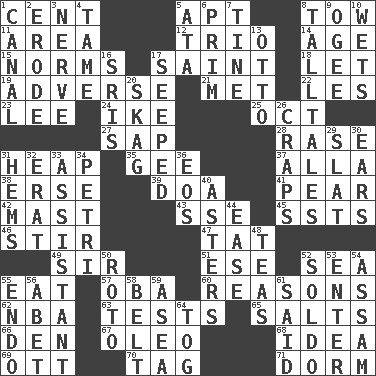 ACROSS 1. Penny 5. Fitting 8. Pull behind 11. Length times width 12. Musical group of three 14. Ripen 15. Typical standards 17. Virtuous person 18. Allow 19. Contrary to your interests or welfare 21. Was introduced to 22. French article 23. Area sheltered from the wind 24. Mamie's husband 25. Sep. follower 27. Plant excrement 28. To erase 31. Pile 35. Unit of force equal to gravity 37. Silent film actress Nazimova 38. Celtic language 39. ___ good deed 41. Lightbulb-shaped fruit 42. Vertical spar for supporting sails 43. Compass dir. 45. Fast planes 46. Commotion 47. Make lace 49. Title for a knight 51. Compass dir. 52. Ocean 55. Ingest 57. Chief or king in Benin or Nigeria 60. Thinks logically 62. Basketball assoc. 63. Trials 65. Table seasonings 66. Lair 67. Butter sub 68. The content of cognition 69. Baseball player Mel 70. Label 71. Dormintory (informal) DOWN 1. Lessep's creation 2. Eat (away) 3. Effrontery 4. Not wild 5. "One Day ___ Time" 6. Demure 7. Prong on a fork 8. Baron Munchausen's specialties 9. Double curve, resembling the letter S 10. Soaks 13. "Beetle Bailey" pooch 16. Indian titles of respect 17. Oozed 20. Heroin 26. Dice game 29. Narrow board 30. Hearing organs 31. Folds over and sews together 32. Part of Q.E.F. 33. Helper 34. _ dish (used to culture cells) 36. Greek goddess of the dawn 40. Michaelmas daisies 44. Relaxation 48. Afternoon social gatherings 50. Printing process, for short 52. Twentieth part of a lira 53. Keyboard key 54. Indian state 55. Inside; within (prefix) 56. Collude with 58. Waist strap 59. Toward the sea 61. Expressed in words 64. Coat; cloak