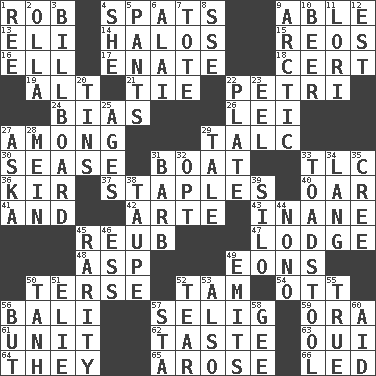 ACROSS 1. Director Reiner 4. Arguments over trivial matters 9. Competent 13. Biblical high priest 14. Saint headwear 15. Vintage cars 16. Pipe bend 17. Related on the mother's side 18. An absolute certainty 19. The first octave above the treble staff 21. Make a knot 22. _ dish (used to culture cells) 24. Prejudice 26. Luau accessory 27. Amid 29. Baby powder 30. Gospel singer Marvin 31. Water vessel 33. Affectionate concern, for short 36. Apertif with cassis 37. Paper fasteners 40. Boat paddle 41. Added to 42. Johnson of "Laugh-In" 43. Empty; void 45. Reuben's nickname 47. Cabin 48. Cleo's killer 49. Immeasurably long periods of time 50. Laconic 52. Scottish cap 54. Baseball player Mel 56. Indonesian resort city 57. Former Milwaukee Brewers owner Bud 59. Mouth or opening 61. A single undivided whole 62. Clothes sense 63. Fr. "Yes" 64. Those things 65. Came up 66. Directed DOWN 1. To sift 2. Rounded earthenware pot or jar 3. Big road sign 4. A female animal or person 5. Leg coverings 6. Jai ____ 7. Carryall 8. Compass dir. 9. Northern region 10. Fermented drink made from hops 11. Australian parrot (variant) 12. Eastern Standard Time (abbr.) 20. Airtight sealed metal containers 22. Food holder 23. Snakelike fish 25. Ripens 27. "____ silly question..." 28. Chow _ 29. Story 31. Sharp remark 32. Choose 33. Inedible or poisonous agaric 34. Long (Scottish) 35. Algonquian 38. Grayish beige 39. Grain storage tower 44. Words to Nanette 45. Noteworthy scarcity 46. Double-curved letter 49. Sends forth 50. Hyperbolic tangent 51. Writer Wiesel 52. Pull into pieces 53. In addition 55. Loyal 56. Yet 57. R.R. building 58. Turn to the right 60. Assist