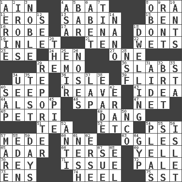 ACROSS 1. The 18th letter of the Arabic alphabet 4. Blind as ____ 8. Mouth or opening 11. Greek god of love 13. Unit of acoustic absorption 15. Benjamin's nick name 16. Loose flowing garment 17. Sports stadium 18. Do not 19. An arm off of a larger body of water 21. Nine, plus one 22. Soaks 23. Compass dir. 24. Layer 27. Single 29. San ____ (Riviera town) 30. Broad, flat, thick pieces 34. Shoshoni 36. Capri or Wight 39. Seductive woman who exploits men 40. Ooze 41. Break or tear apart 43. The content of cognition 44. Columnist Joseph or Stewart 46. Practice fight 47. Fish or hair follower 48. _ dish (used to culture cells) 49. Mild oath, euphamism for damn 51. Beverage made from leaves 53. And so on (abbr.) 54. 23rd letter of the Greek alphabet 57. Ancient Persian 60. Compass dir. 63. Stares at amorously 65. The sixth month of the Jewish calendar 66. Laconic 69. Shout 70. Marina Del _, California 71. Come out of 72. Light colored 73. Followers of ems 74. Person who is morally reprehensible 75. Fast jet (abbr.) DOWN 1. Nest on high 2. Metal shackles 3. Impressive in appearance 4. White ___ sheet 5. Oblong piece of solid material 6. Collude with 7. Prong on a fork 8. Mitch Miller's instrument 9. Monthly bill 10. Pismires 12. Perceive with the eye 14. Billionth: prefix 18. Home 20. Definite Article 25. Arab leader 26. Olfactory organs 28. Overdraft (abbr.) 29. Newsperson 31. Helper 32. Cy Young winner Saberhagen 33. R.R. building 34. Ubangi River tributary 35. Trial 37. Infant locale 38. Dodge 40. Plant excrement 42. Part of Q.E.F. 45. Sliced dessert 50. Non-commissioned officer (abbr.) 52. Opposed to 54. Entreaties 55. Exchanges for money 56. Small island 57. Female horse 58. Genesis locale 59. 24-hour periods 61. Soft 62. Celtic language 64. Swindle 67. Take to court 68. Snakelike fish