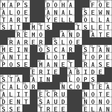 ACROSS 1. Atlas contents 5. Capital of the state of Qatar 9. Enemy 12. _ vera 13. Of or related to the anus 14. Stitched 15. Small pie 16. Shout 17. Rounded earthenware pot or jar 18. Be seated 19. Mountains (abbr.) 21. Small island 22. San ____ (Riviera town) 24. Plus 26. Had dinner 27. More uncommon 28. _ gin 29. Count _ (2 wds.) 30. Witty Wilde 32. Comedian Laurel of Laurel & Hardy 36. Against 37. Car dealer's back yard 38. Drink excessively 39. Introduce or present, as a question 40. French painter Edouard 42. To erase 43. 4th largest of the Great Lakes 44. Stay 46. R.R. building 49. The 18th letter of the Arabic alphabet 50. Chops off 51. Bodily heat indicating an inflammation 53. Non-commissioned officer (abbr.) 54. Afternoon social gathering 57. Came down and settled, as after flight 58. Shade of tan 61. Brief written record 62. Incision 63. Saudi Arabian king (1953-1964) 64. Words to Nanette 65. Compass dir. 66. Relationship diagram 67. Liveliness DOWN 1. Floor protectors 2. Mountain range southwest of Kyrgyzstan 3. Likenesses of persons 4. Arrange properly for use 5. 24-hour periods 6. Single 7. Actor Linden 8. 100% 9. Man or boy (slang) 10. A small or young owl 11. Related on the mother's side 14. Mayday 19. Madame (abbr.) 20. "Corrida" creature 21. Binary compound 23. Bert's buddy 24. Having winglike extensions 25. Not either 27. Former U.S. Attorney General Janet 28. Biscuitlike quick bread 29. Atlas unit 31. Killed 32. Empty completely 33. Inedible or poisonous agaric 34. Domed church section 35. Born 40. Medical imaging device (abbr.) 41. Baby powder 43. Hearing organ 45. Surprise greeting 46. Loads 47. Falsehoods 48. Place in a line 52. Baseball player Mel 53. Naked 55. Inactive volcano in Sicily 56. A really long time 58. Eastern Standard Time (abbr.) 59. Auto 60. Sorrow 61. Compass dir.