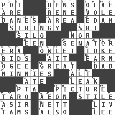 ACROSS 1. Plant holder 4. Hiding places for outlaws 8. Norwegian king 12. "We ___ not amused" (Victoria) 13. French philosopher Descartes 14. Grand slam 15. Natives or inhabitants of Denmark 18. Type of rug 19. Dutch treat 20. Slender, wiry 22. Indian title of respect (Mr.) 23. Grain storage tower 24. And not 25. Car or cant ending 26. Legislator 30. Period 33. A small or young owl 36. Puff or smoke 37. Auction offers 39. Small island 40. Merit 41. Double curve, resembling the letter S 42. Relatively large 44. Male parent 45. Simpletons 47. The first octave above the treble staff 50. Had dinner 51. Path through which fluid escapes 53. Parent Teacher Assoc. 54. Photo 57. Pacific island yam 59. Period of immesurable duration 61. Vertical member of a panel or frame 63. SW Saudi Arabia district 64. Remaining after all deductions 65. 54 in ancient Rome 66. Scottish caps 67. In addition 68. Area sheltered from the wind DOWN 1. Groovy apt. 2. Mouths or openings 3. Portable shelters 4. To trail on the ground 5. Suggestive of the supernatural 6. Compass dir. 7. Ocean 8. Make much ado about nothing 9. Farming town in central California 10. Insect wing 11. Opposite of masc. 16. One of the Great Lakes 17. Drop; flow; fall 21. Words to Nanette 22. Boy, to dad 24. Fish or hair follower 26. Stalk of a moss capsule 27. Frog relative 28. Gumbo ingredient 29. Tear apart 30. Inky black, to poets 31. Swiss mountan, "Queen of the Mountains" 32. Arabian gulf 34. Armed conflicts 35. Falsehood 38. Legislators 42. Turn to the right 43. Baby powder 46. Call ___ day 48. Allows 49. Tense 52. The principal food of baleen whales 53. Demure 54. Cooking vessels 55. To the inside or interior of 56. Writer Wiesel 57. Make lace 58. White ___ sheet 59. Santa ___, CA 60. Snakelike fish 62. First lady
