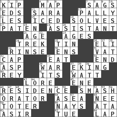 ACROSS 1. Sleep 4. Atlas unit 7. Droops 11. Begley and Asner 12. "Two Mules for Sister ____" 13. Chummy 14. French article 15. On the rocks 16. Finds the solution 17. Eucharist need 19. Aide 21. Ripen 23. Eons 24. Long journey 25. Metal container 26. Biblical high priest 29. Wash lightly 30. Followers of ems 31. Large container 32. Head covering 33. Erode 34. Conclude 35. Viper 36. Armed conflict 37. Supplementing with great effort 40. Marina Del _, California 41. It is 42. Electrical Unit 43. Old wives' tales, e.g. 45. Compass dir. 46. Home 51. Box-office sellout 55. Speaker 56. At sea 58. Born 59. Carrier 60. Negative votes 61. "One Day ___ Time" 62. SW Saudi Arabia district 63. Third day of the wk. 64. Infant locale DOWN 1. Seaweed 2. It may be bright or harebrained 3. Inconspicuous attention getter 4. Apple computer (short form) 5. Type of rug 6. Writing tablets 7. Table seasonings 8. Inventor's middle name 9. Small, secluded valley 10. System (abbr.) 12. Scorches 13. Introduce or present, as a question 16. Omens 18. Merit 20. Virtuous person 22. Make supply last 24. Likely to tip or tilt 25. Rends 26. Happening 27. Austrian-born American filmmaker Fritz 28. It would 29. To erase 32. Auto 33. Eroded 36. One who wires 37. She-sheep 38. Sunflower state 39. Detail 43. 61 cubic inches 44. Scent 46. Roll call or roster of names 47. Greek god of love 48. Suttee (variant) 49. Patter 50. He sold his birthright 52. Of or related to the anus 53. Bristle 54. Pile 57. Sight organ
