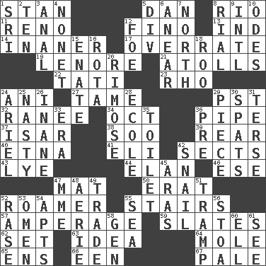 ACROSS 1. Comedian Laurel of Laurel & Hardy 5. One of the 12 tribes of Israel 8. River (Sp.) 11. Western Nevada city 12. Fine (Spanish) 13. Working for oneself (abbr.) 14. More empty; more void 17. Make much ado about nothing 19. Poe poem 21. Ringlike coral islands and reefs 22. Jacques of French films 23. 17th letter of the Greek alphabet 24. Cuckoo 27. Not wild 29. Pacific Standard Time (abbr.) 32. Indian princess (variant) 34. Sep. follower 36. Corncob 37. Austrian river, tributary to the Danube 38. "Barney Miller" actor Jack 39. Rump 40. Inactive volcano in Sicily 41. Biblical high priest 42. Religious groups 43. Potassium hydroxide 44. Style 46. Compass dir. 47. Floor protector 50. Part of Q.E.F. 52. Wanderer 55. Flight of steps 57. Electrical Measurement 59. Chalkboards 62. Arrange properly for use 63. It may be bright or harebrained 64. Undercover agent 65. Followers of ems 66. Car or cant ending 67. Light colored DOWN 1. _ Lanka 2. "___ Little Indians" 3. Of or related to the anus 4. Music written for nine 5. HTML Container Element 6. Approach 7. 0 degrees 8. Monetary unit of Yemen 9. International (abbr.) 10. Lyric poems 12. Enemy 15. Related on the mother's side 16. Roll call or roster of names 18. Friend of Pooh 20. Full of chinks, cracks, or crevices 24. Satellite of Uranus 25. Offensive 26. Lacking in sense or substance 28. Learning spot: Fr. 29. Component 30. Arguments over trivial matters 31. Laconic 33. Period 35. Bathroom plumbing fixture 36. Before (prefix) 42. Slow-paced one 45. Caspian sea tributary 47. Madame (abbr.) 48. Nest on high 49. Buy and sell 51. _____ steamer (cargo ship) 52. To erase 53. Presage 54. Tenement units (abbr.) 55. Ocean 56. Portico 58. Commissioned military rank (abbr.) 60. Pipe bend 61. Perceive with the eye
